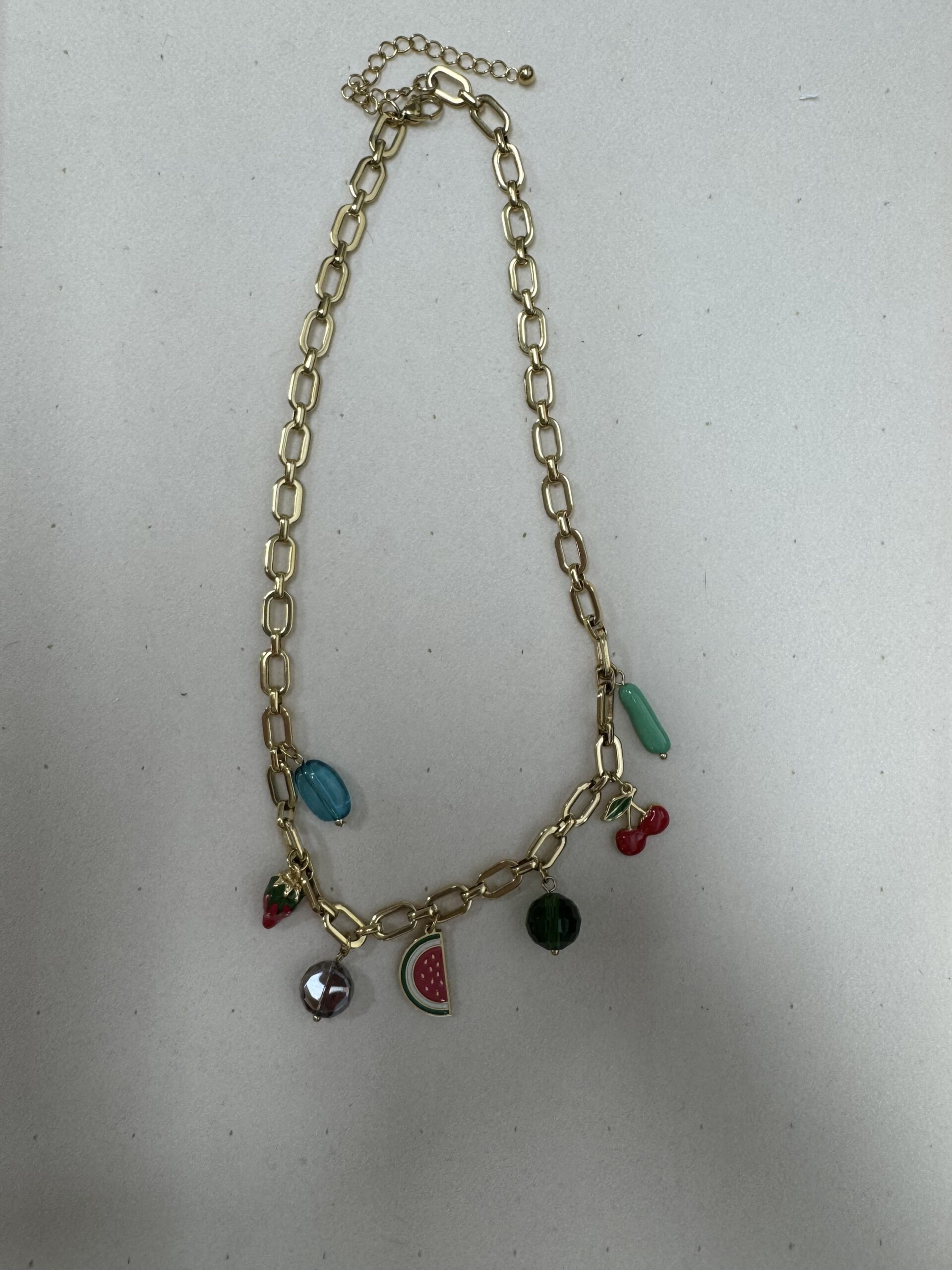 Diseño: Cadena con dijes de frutas y abalorios de colores (sandía, cerezas, fresa, cuentas verdes y azules).