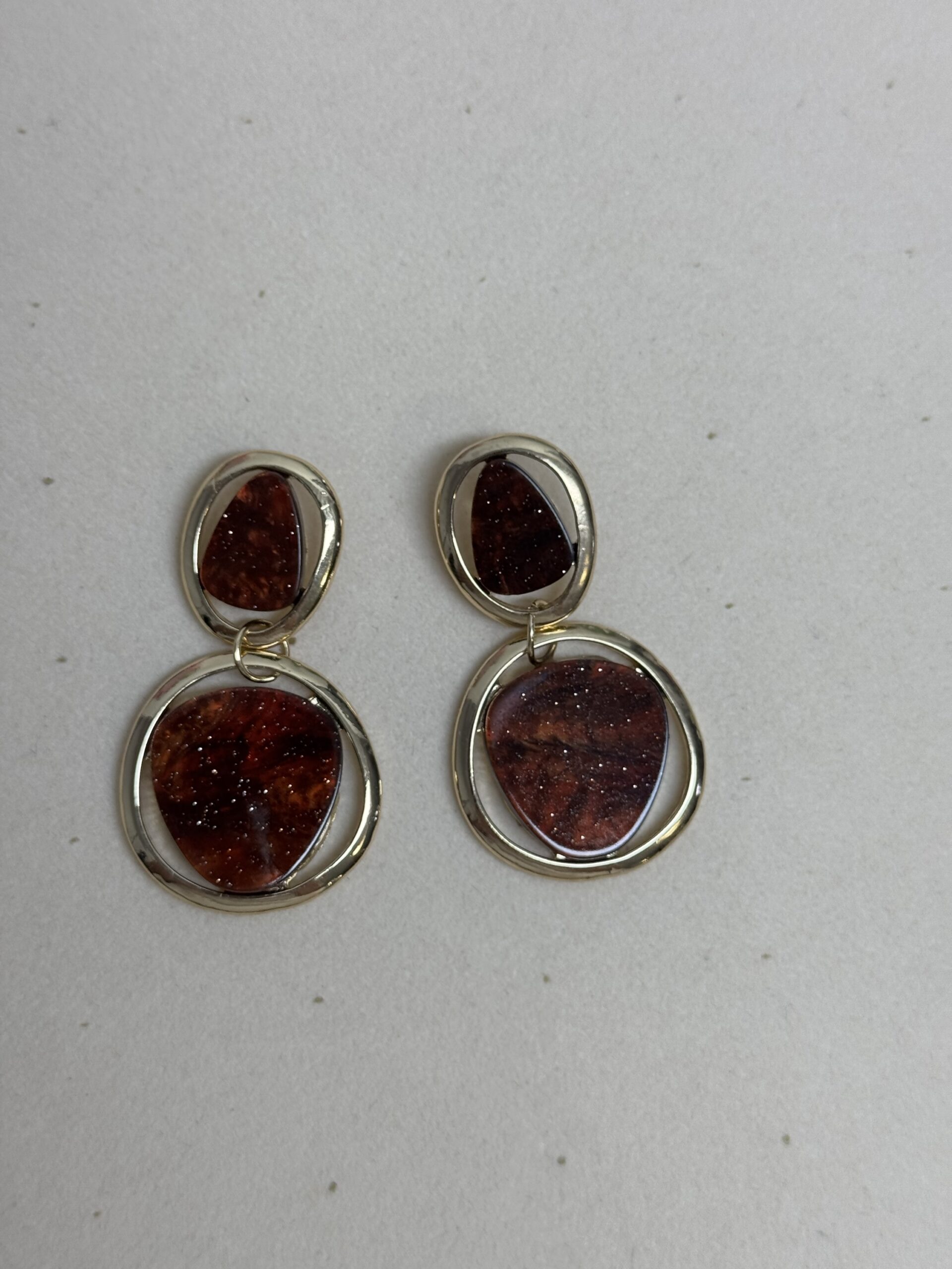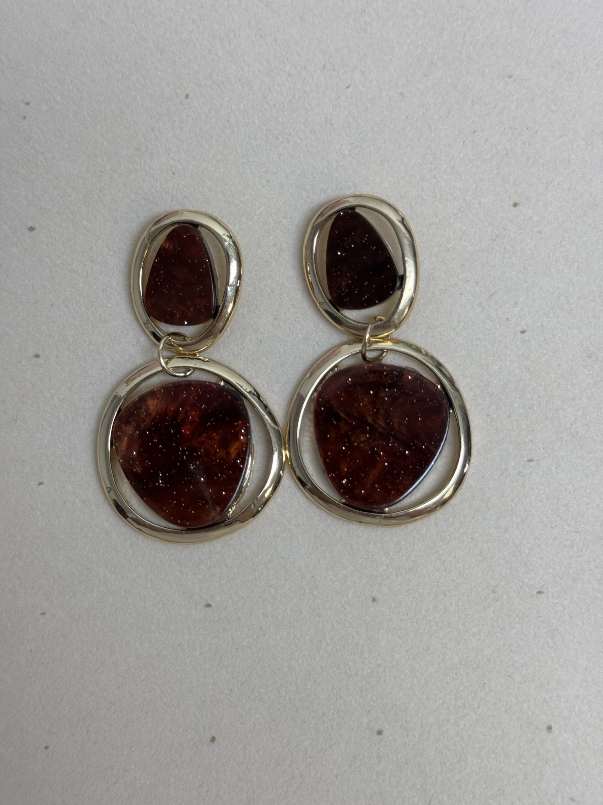 Pendientes de diseño elegante con doble pieza: una superior tipo botón y una base colgante enmarcada en aro metálico. El centro presenta una pieza lisa con acabado brillante que aporta contraste y sofisticación.