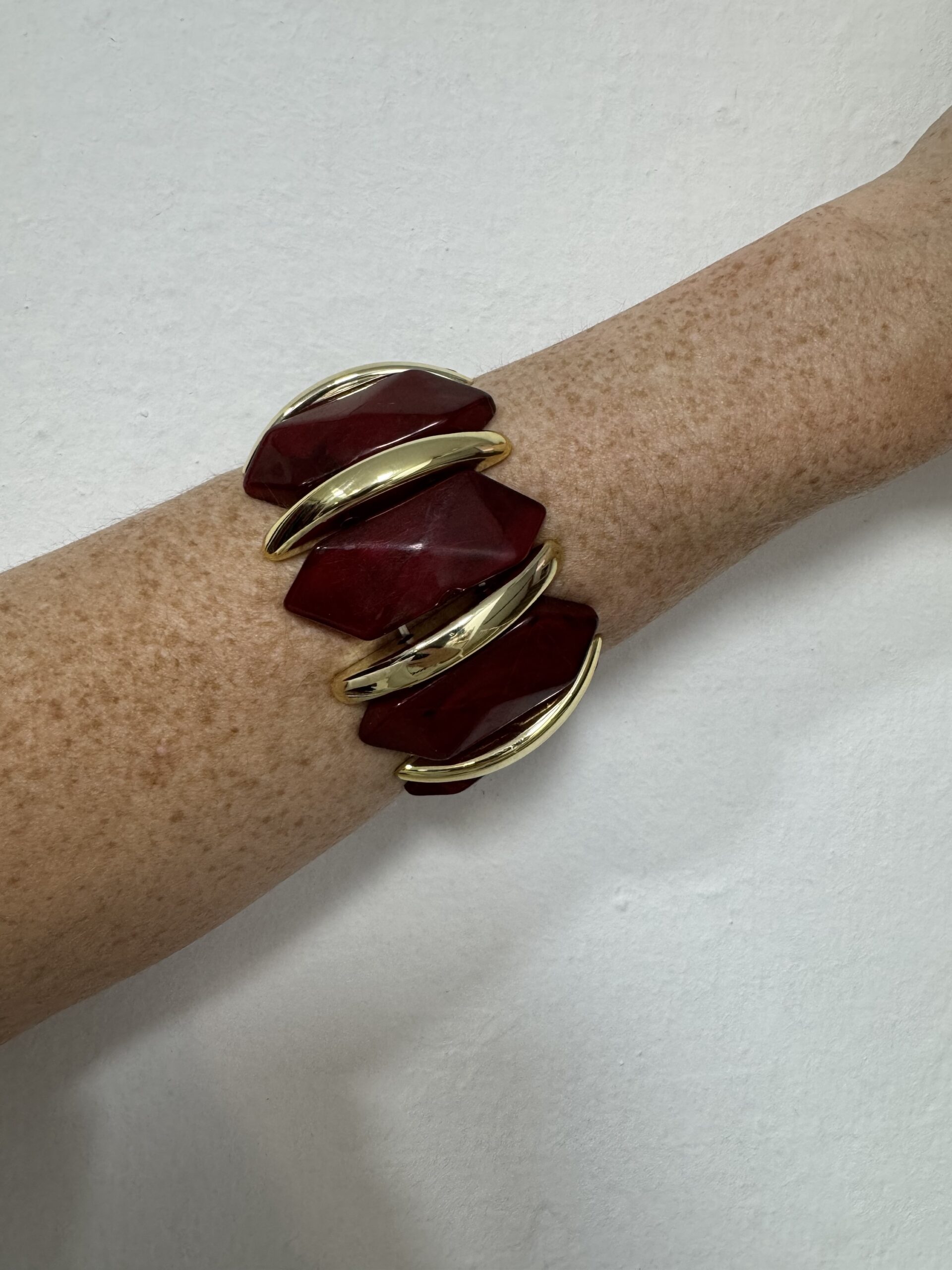 Pulsera de diseño elegante y flexible, compuesta por piezas facetadas combinadas con aros metálicos que aportan un toque sofisticado. Su sistema elástico permite un ajuste cómodo a diferentes tamaños de muñeca.