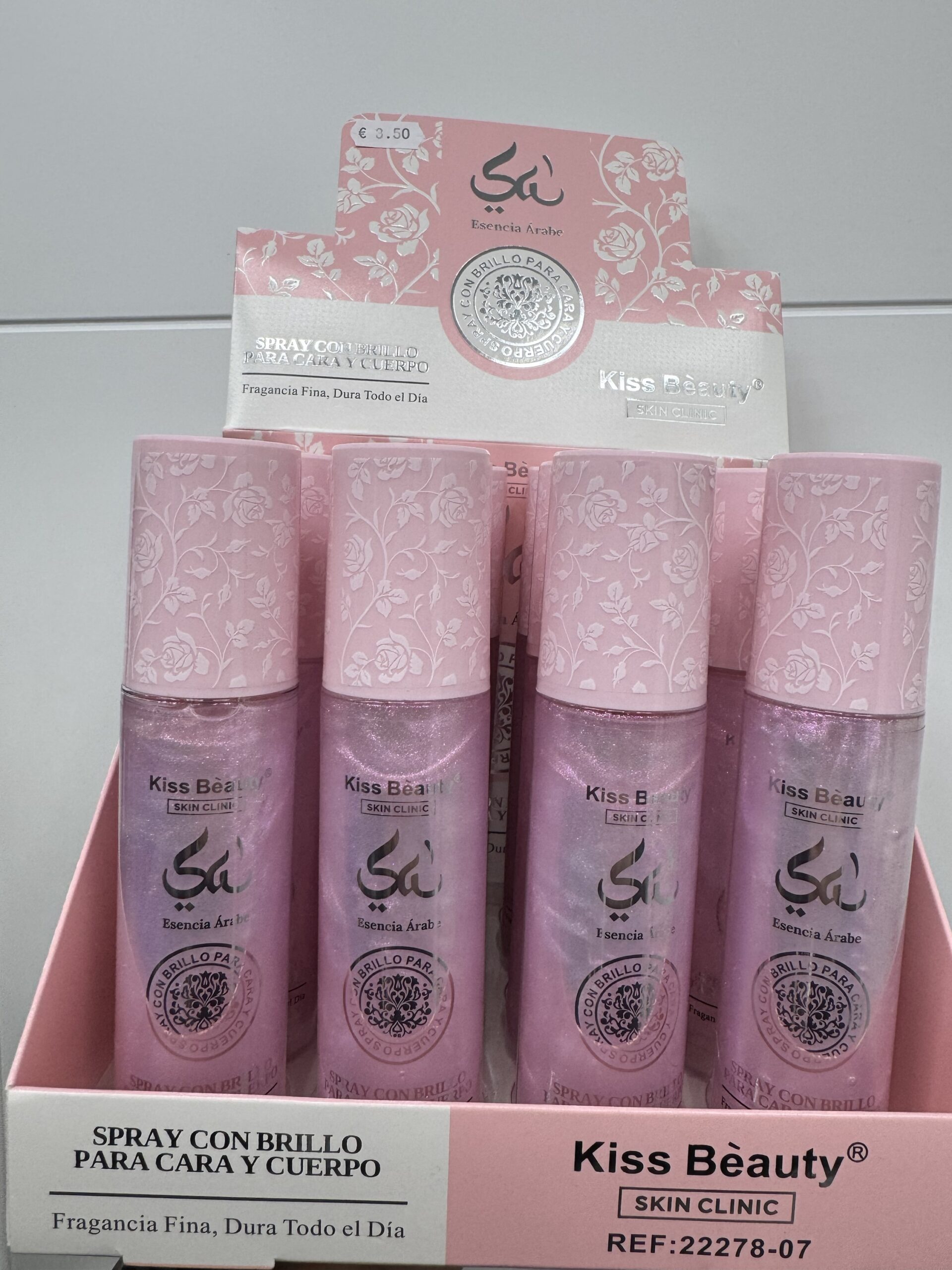 Spray iluminador Kiss Beauty Skin Clinic – Esencia Árabe para rostro y cuerpo, diseñado para aportar un efecto brillo glow inmediato a la piel. Su fórmula ligera ayuda a realzar la luminosidad natural, dejando un acabado radiante, fresco y suave. Ideal para ocasiones especiales, maquillaje, sesiones de fotos o para dar un toque brillante diario.