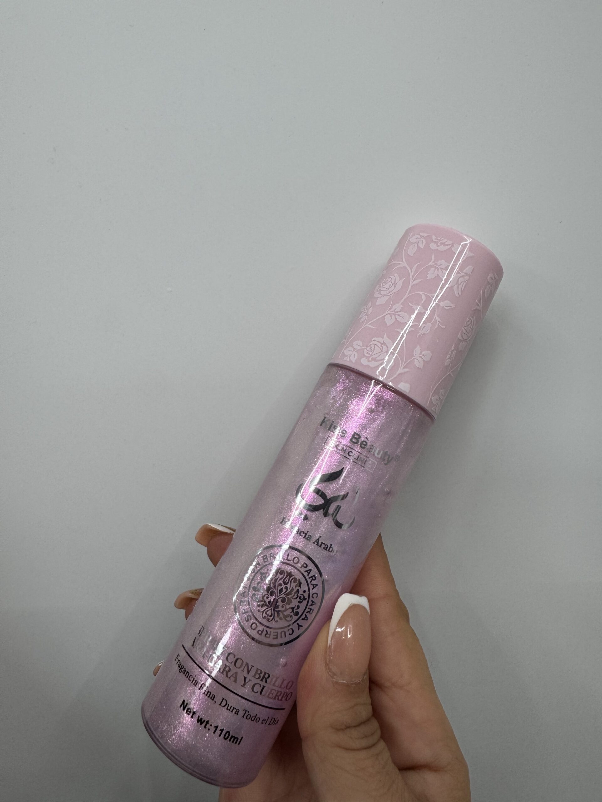 Cuenta con una textura ligera en spray, fácil de aplicar y de rápida absorción, con un acabado brillante y elegante que resalta la piel sin sensación pesada. Presentación en envase moderno color rosa con un diseño atractivo y práctico.