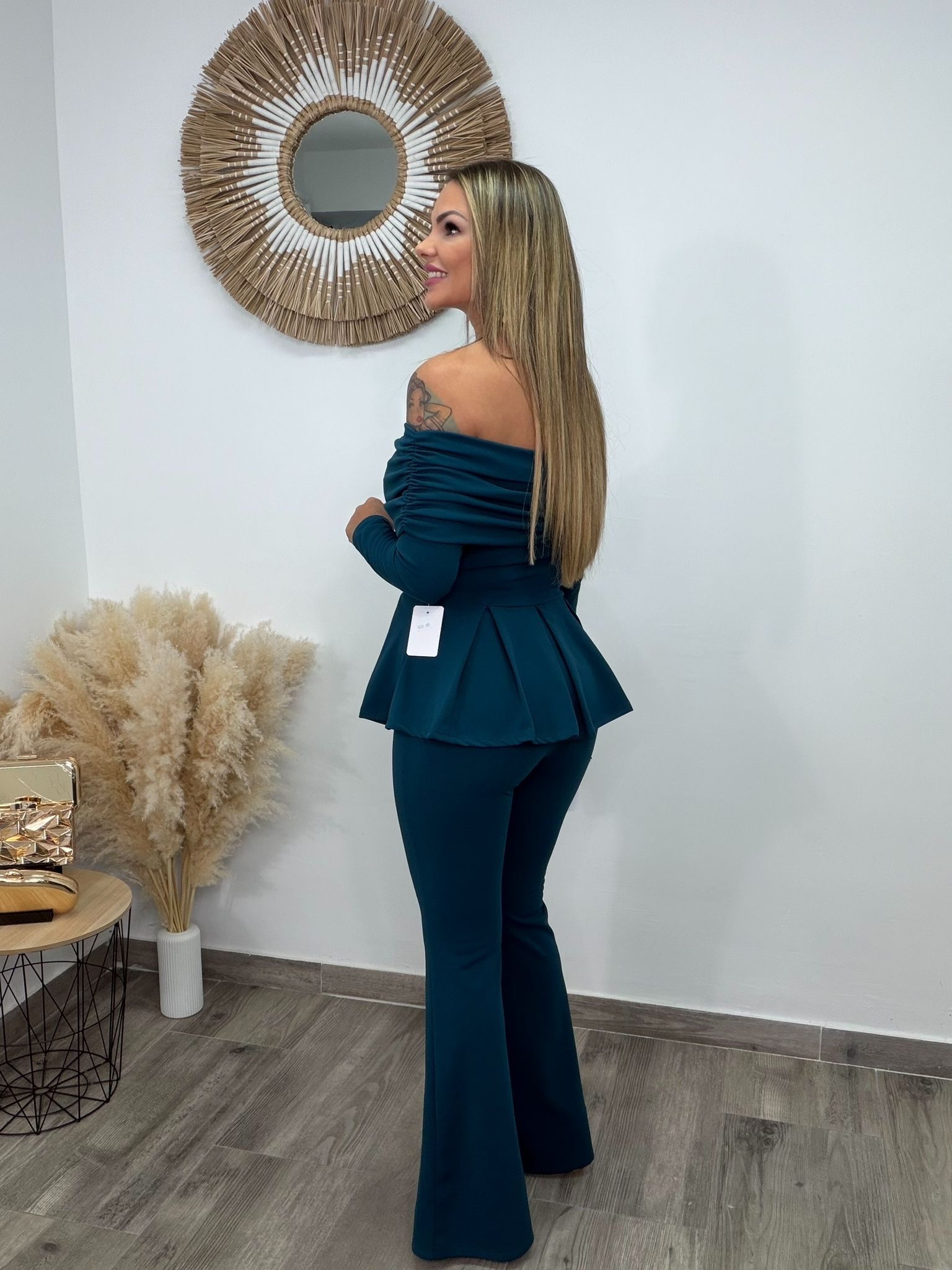 Conjunto de dos piezas elegante y moderno, ideal para destacar en cualquier ocasión especial. La blusa tipo off-shoulder (hombros descubiertos) cuenta con un delicado fruncido en el busto y mangas largas, aportando un toque sofisticado y femenino. Su diseño entallado con corte tipo peplum realza la figura y define la cintura.