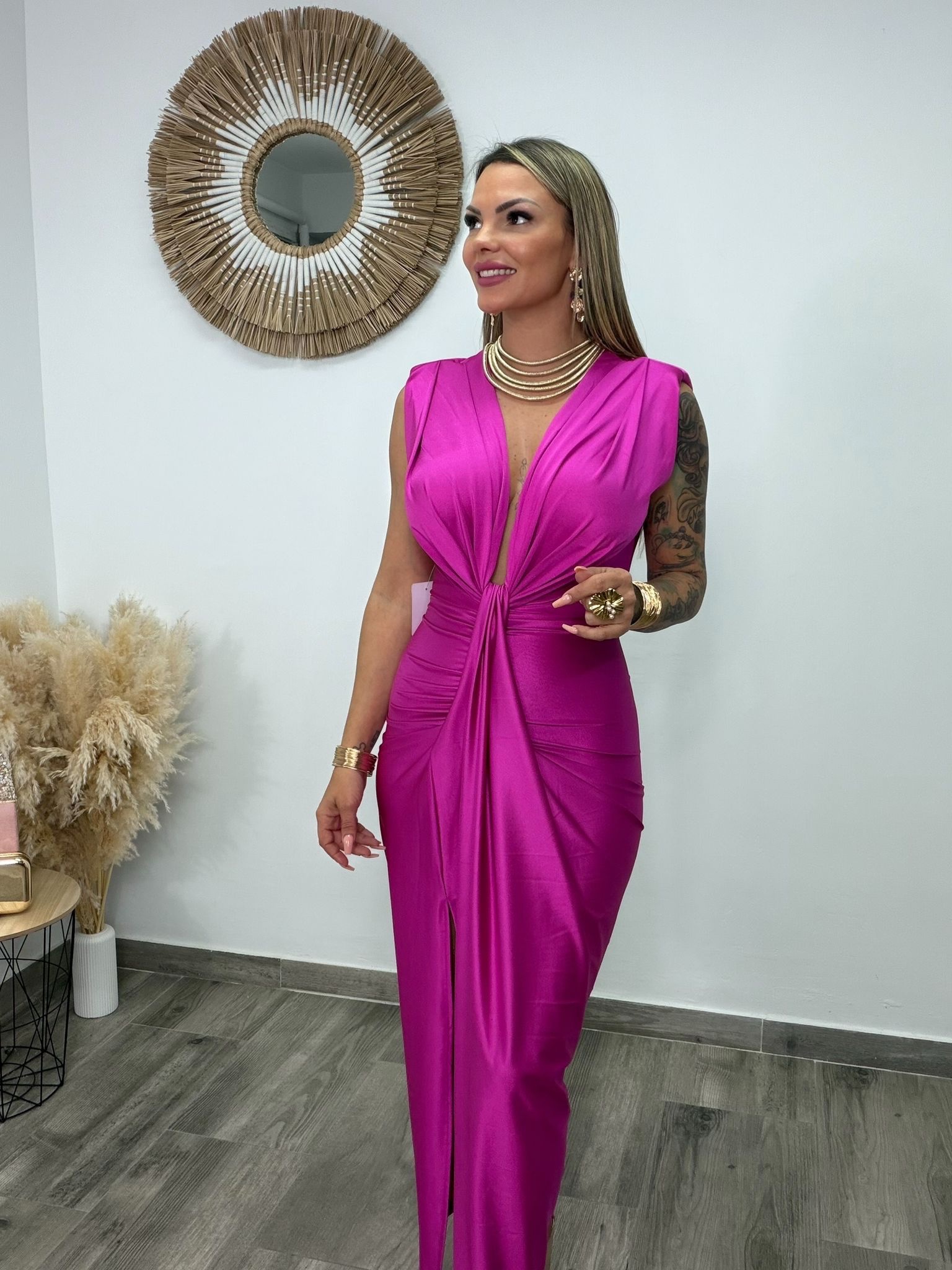 En la parte frontal luce un escote profundo en “V” con drapeado, rematado con un nudo central en la cintura, que estiliza y crea un efecto reloj de arena. La falda larga cae con fluidez y está realzada por una raja frontal derecha que añade movimiento y sensualidad a cada paso.