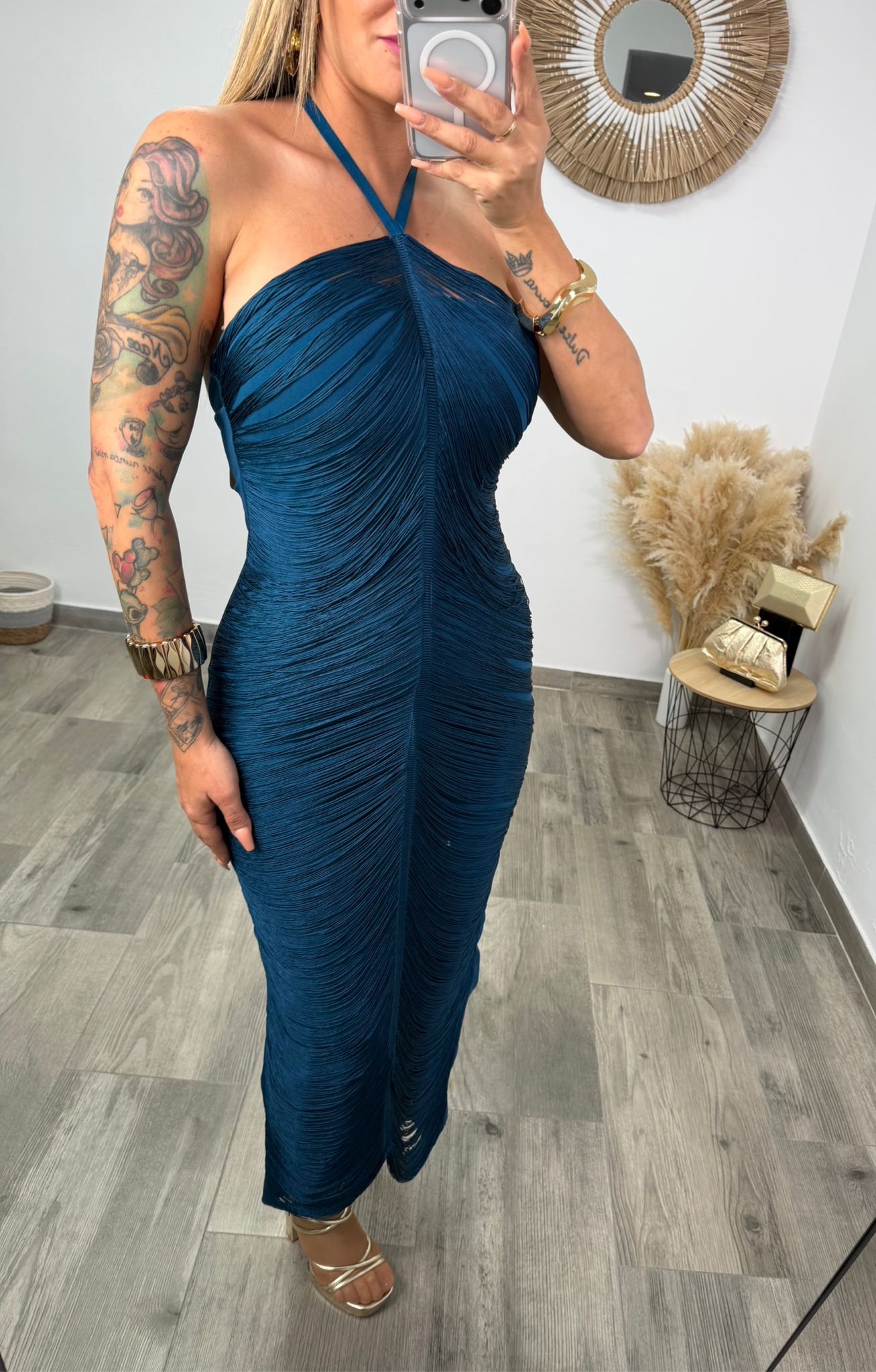 Este elegante vestido largo de flecos es una apuesta segura para destacar en cualquier ocasión especial. Su diseño de cuello halter, sujeto con una delicada cinta tipo lencera, realza los hombros y estiliza la silueta con un toque sofisticado y femenino.