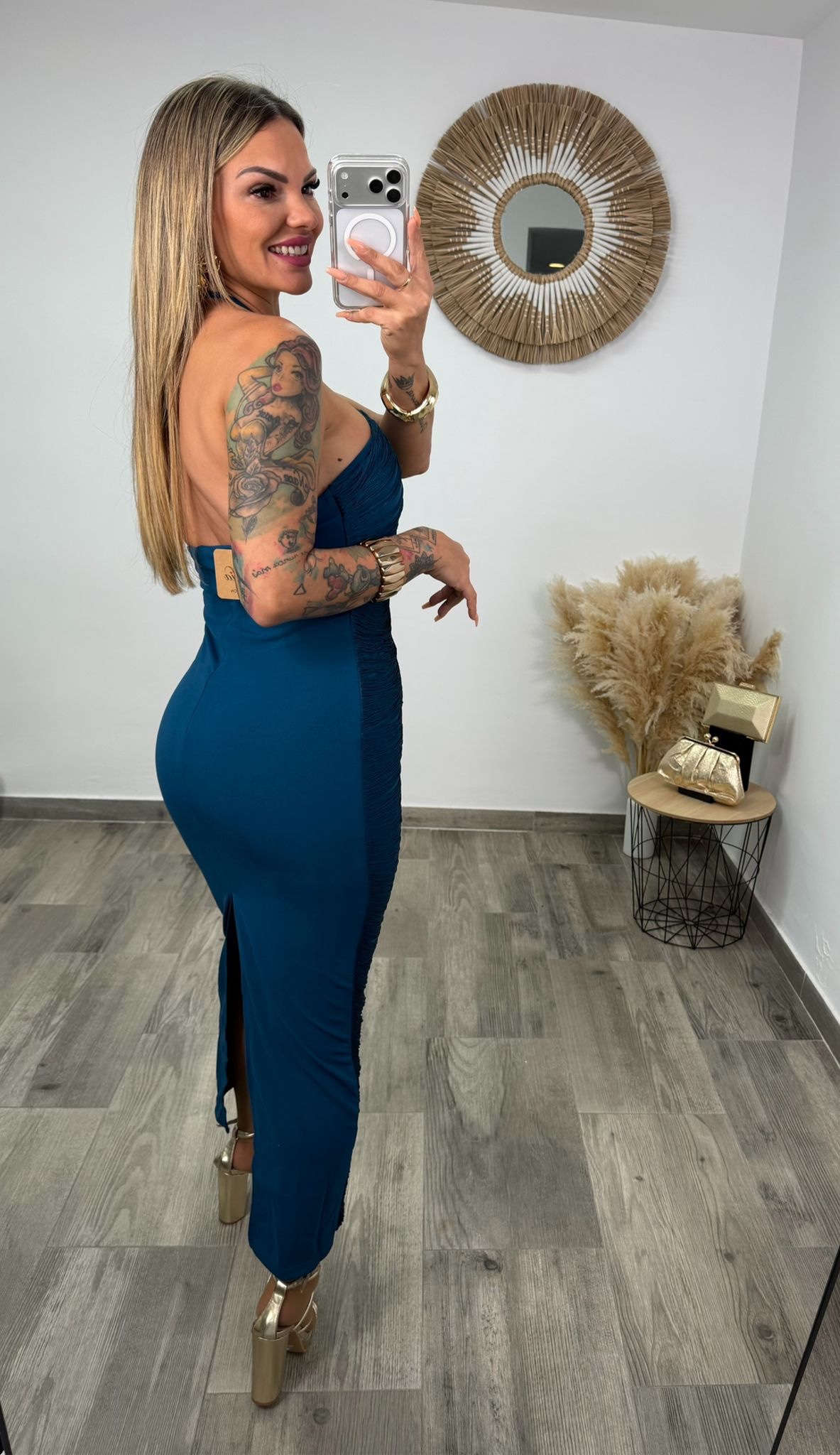El tejido de flecos crea un efecto visual envolvente y lleno de movimiento, aportando glamour y elegancia en cada paso. Además, su composición ligeramente elástica se adapta suavemente al cuerpo, ofreciendo comodidad sin perder su forma y realzando la figura de manera natural.