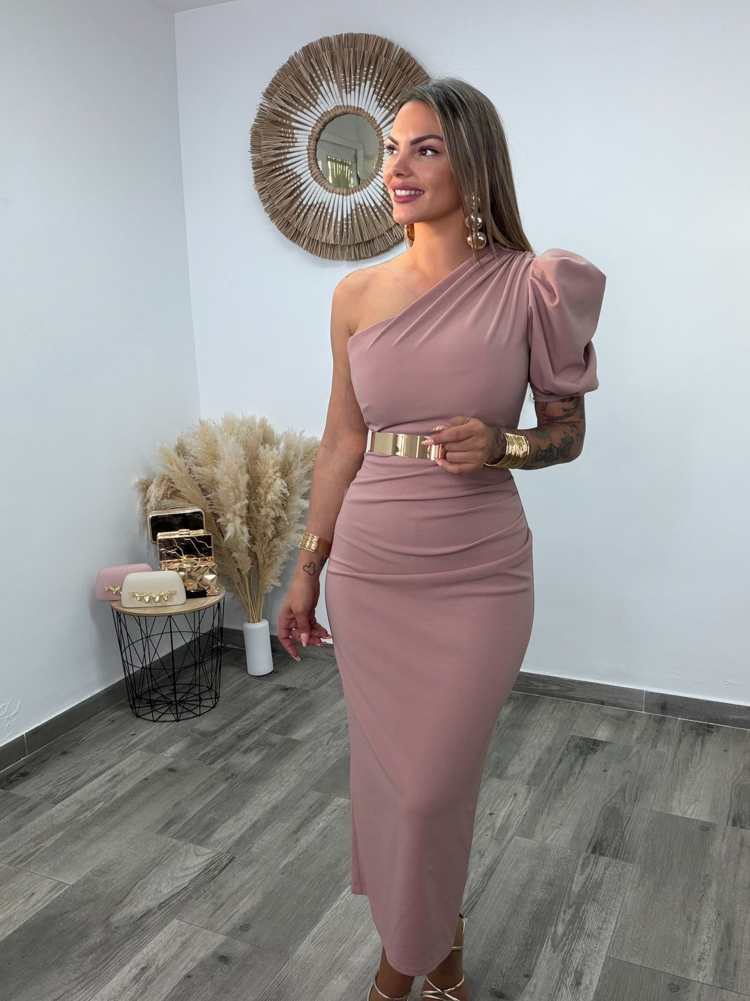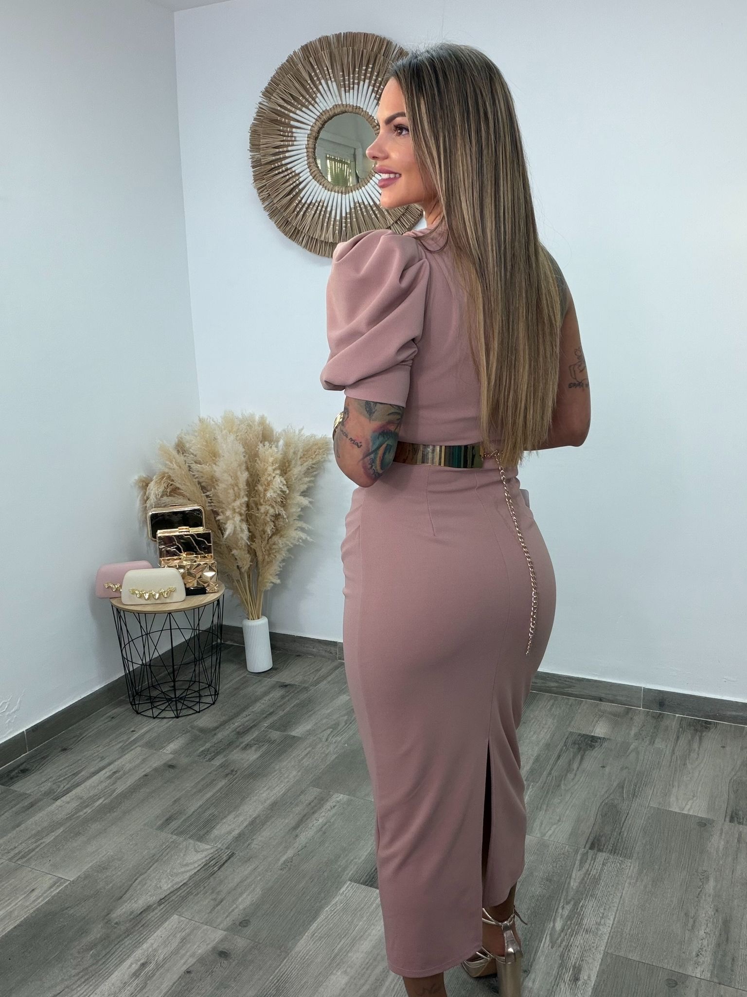 La cintura queda definida y estilizada con la opción de cinturón metálico, mientras que la falda de corte entallado cae elegante hasta el suelo, rematada con una raja discreta en la parte trasera, que facilita el movimiento y añade un toque sensual y refinado.