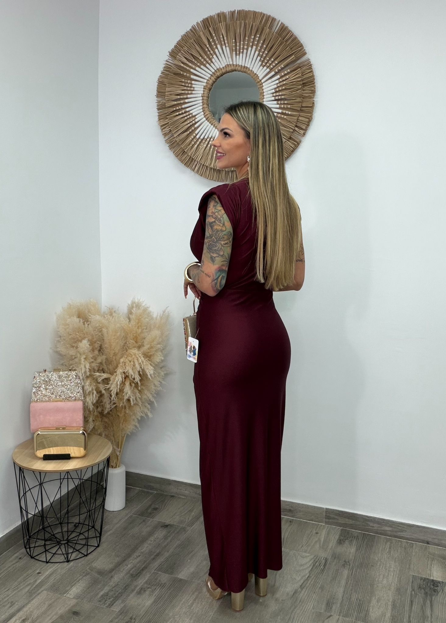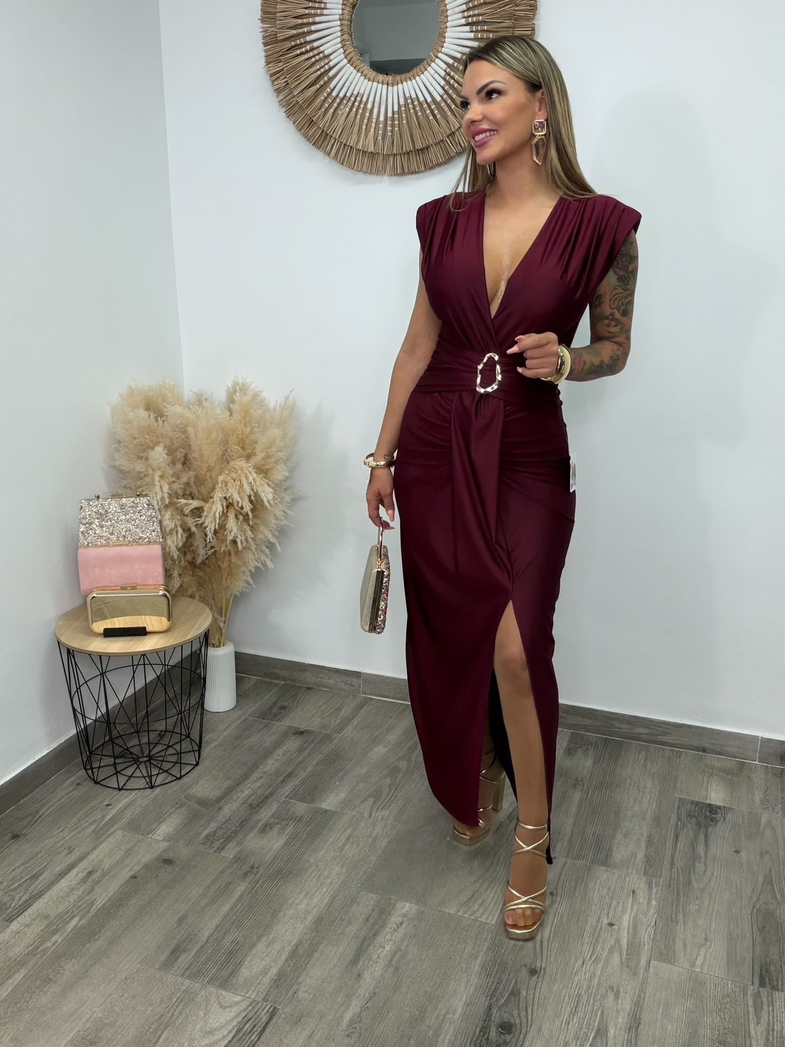 Vestido largo de fiesta, confeccionado en tela muy elástica que se adapta a la silueta realzando las curvas con elegancia. Su diseño cuenta con hombreras incorporadas, que aportan estructura y sofisticación, equilibrando el profundo escote en pico cruzado que estiliza el cuello y el busto.