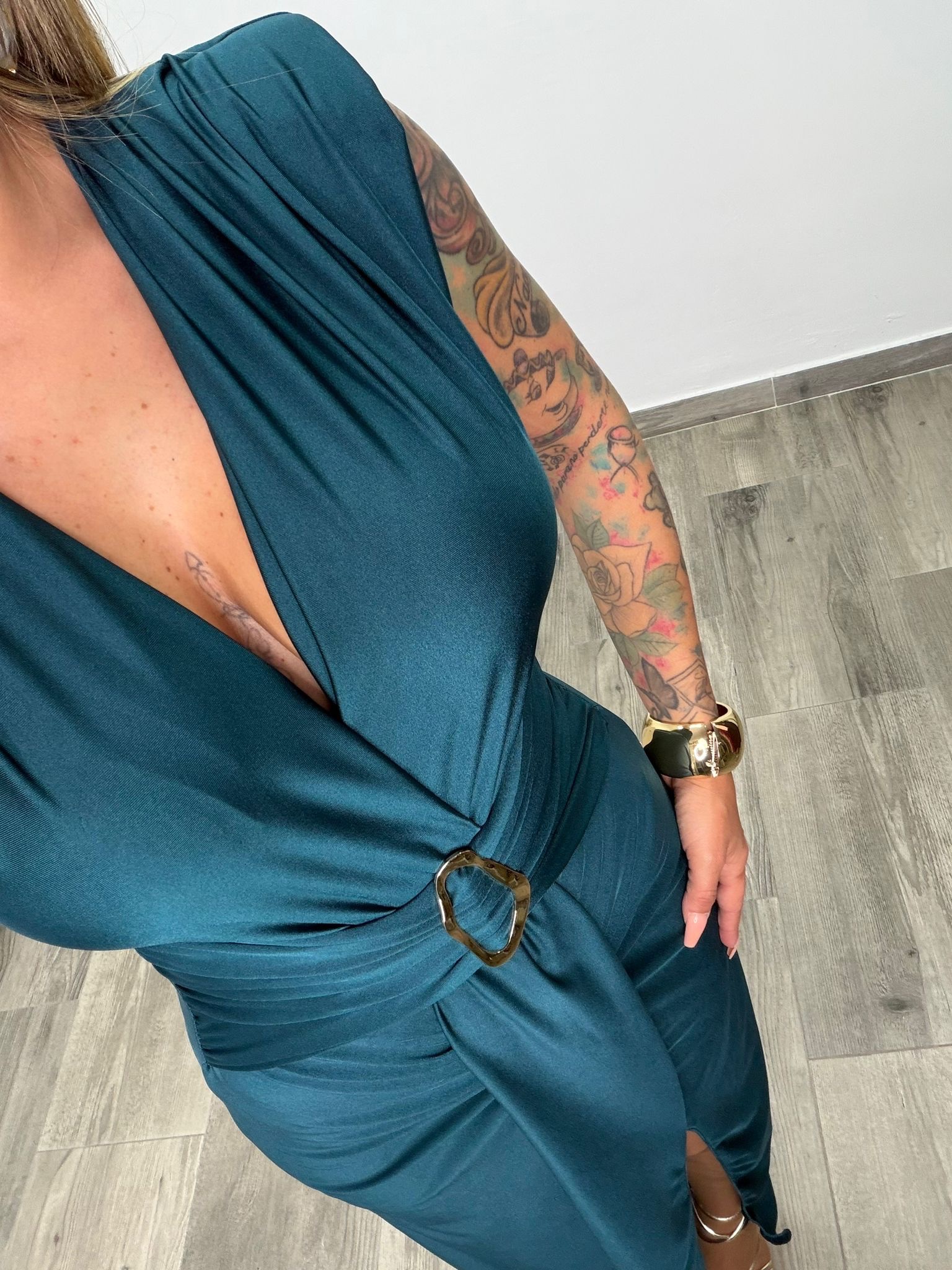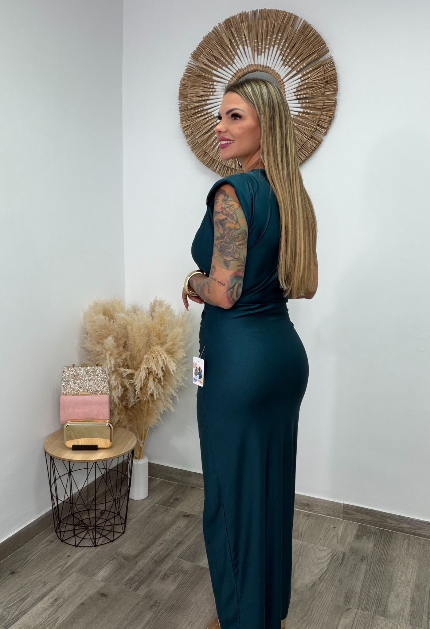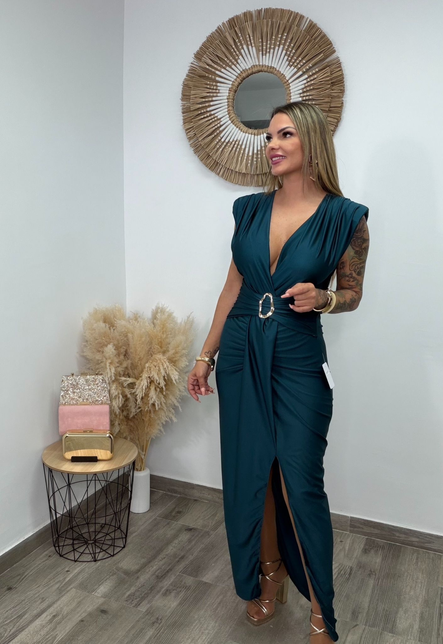 Vestido largo de fiesta, confeccionado en tela muy elástica que se adapta a la silueta realzando las curvas con elegancia. Su diseño cuenta con hombreras incorporadas, que aportan estructura y sofisticación, equilibrando el profundo escote en pico cruzado que estiliza el cuello y el busto.