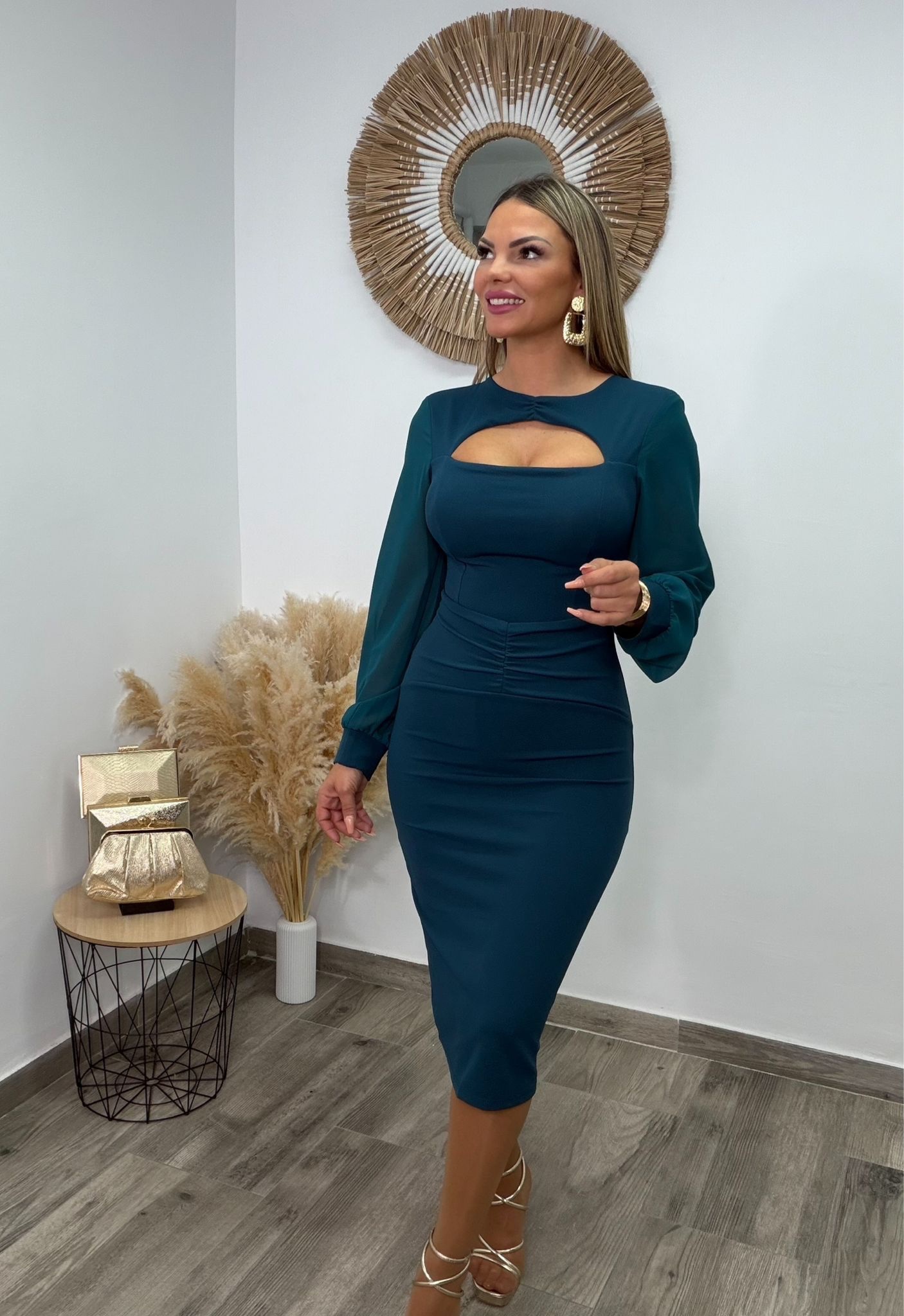 El cuerpo estructurado se complementa con un original escote con abertura tipo “casco” en el pecho, que aporta un toque moderno y sutilmente sensual sin perder refinamiento. Las mangas largas de gasa semitransparente añaden ligereza y movimiento, creando un contraste delicado con el tejido principal.