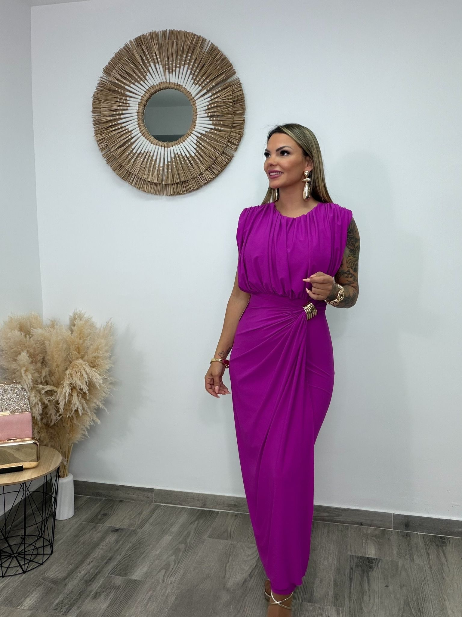 Vestido de corte elegante con silueta drapeada que realza la figura con sutileza y sofisticación. Presenta un escote cerrado con frunce suave y un delicado botón en la parte trasera del cuello para un acabado pulido. La cintura se ajusta con un detalle metálico que aporta un toque distintivo, mientras que la caída envolvente de la falda crea un efecto favorecedor y estilizado.