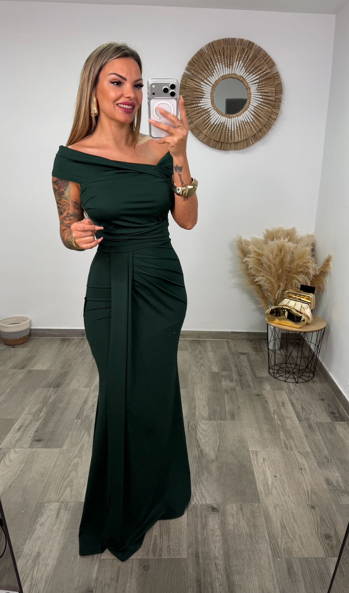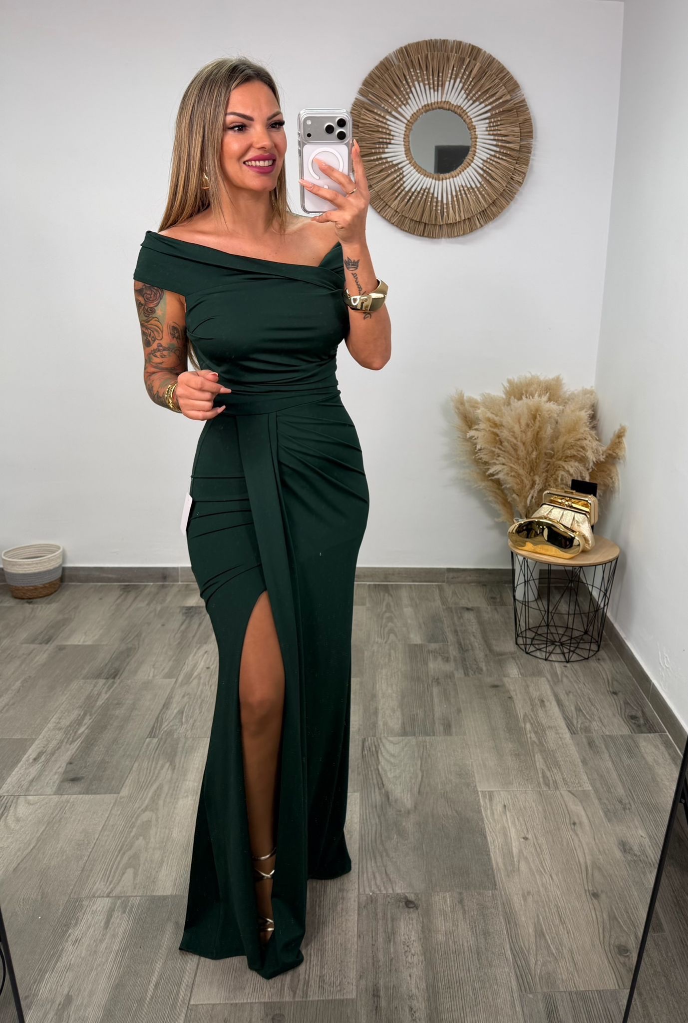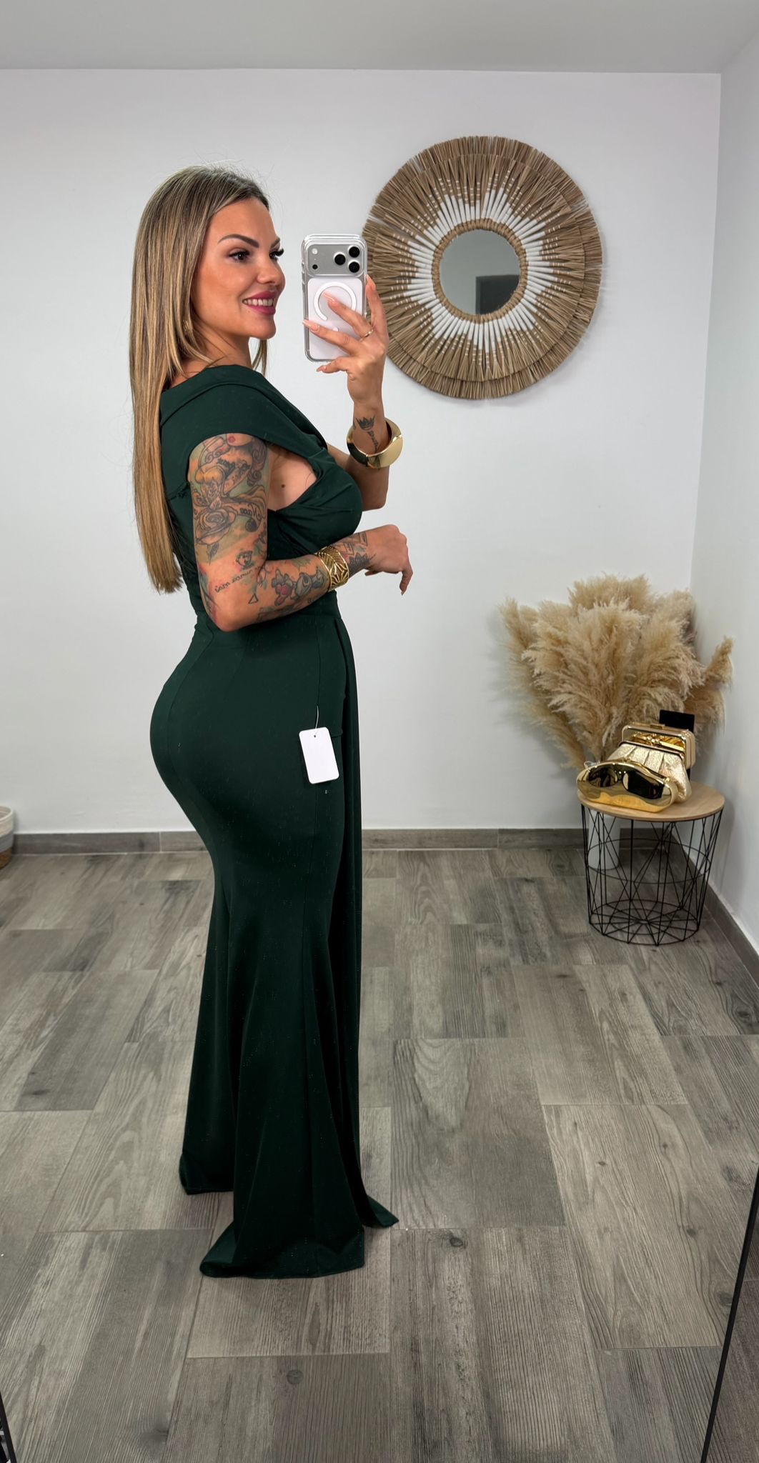 Vestido largo de diseño asimétrico, elegante y muy favorecedor. Su escote estilo barco con acabado cruzado en el pecho aporta un toque sofisticado y femenino, realzando la parte superior del cuerpo.