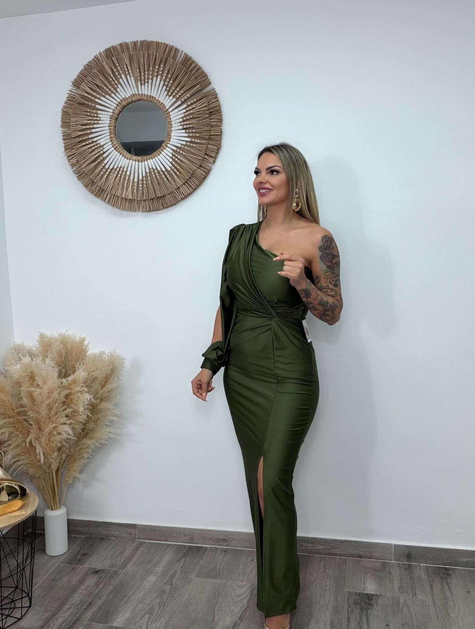 El frente destaca con un drapeado en el abdomen y un nudo lateral que estiliza la cintura, mientras que la falda larga se completa con una raja en la pierna izquierda, que añade sensualidad y movimiento a cada paso. Las tonalidades elegidas de nuestro Vestido Dalia refuerza su estilo delicado y romántico, perfecto para bodas, galas o eventos de noche.