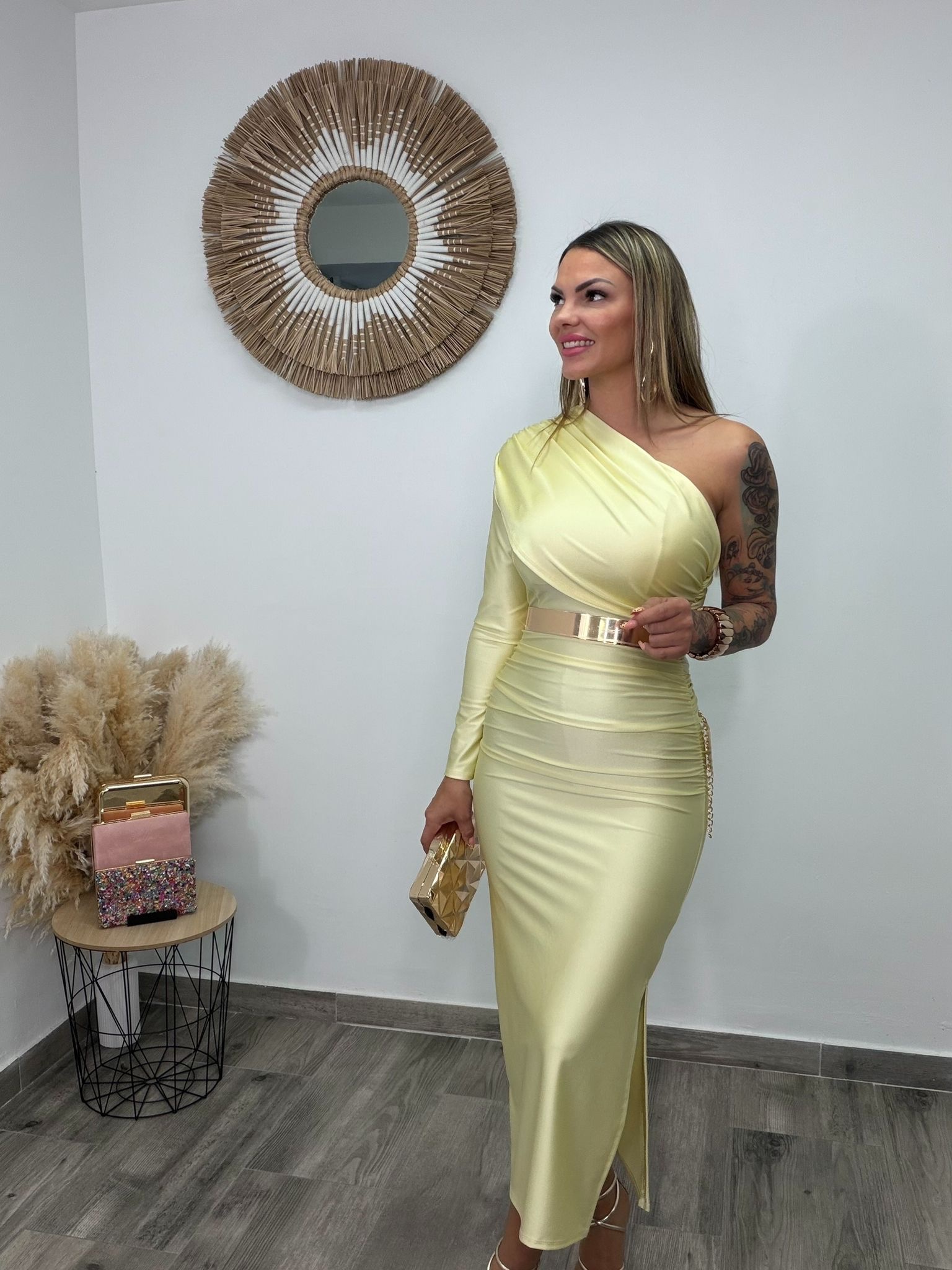 Un vestido de fiesta elegante y sofisticado, confeccionado en tela elástica que se adapta a la silueta realzando las curvas con comodidad. Su diseño asimétrico resalta la feminidad: lleva manga larga en el lado izquierdo, mientras que el hombro derecho queda descubierto, creando un escote único y favorecedor.