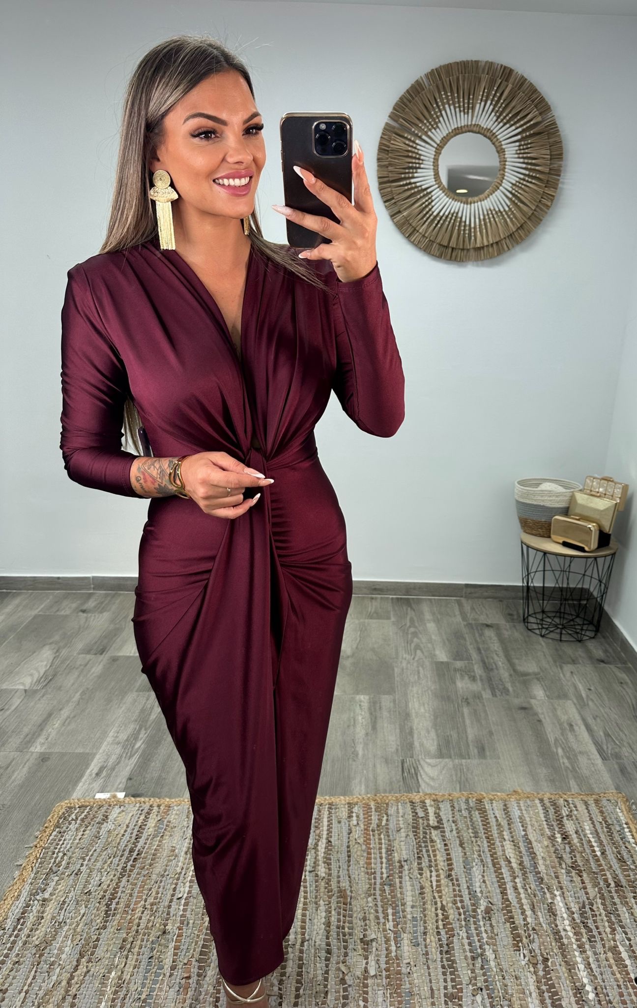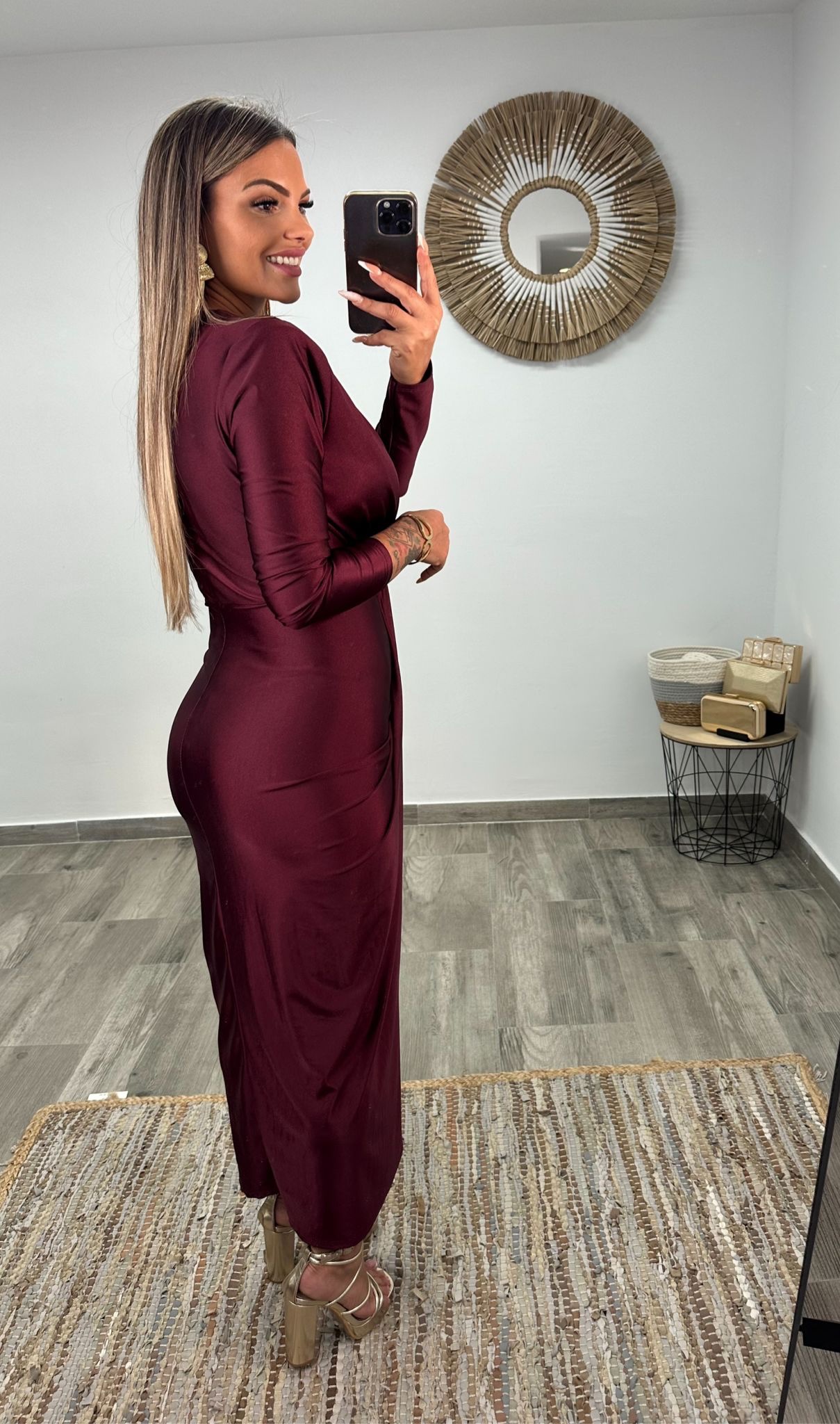 En la parte frontal luce un escote profundo en “V” con drapeado, rematado con un nudo central en la cintura, que estiliza y crea un efecto reloj de arena. La falda larga cae con fluidez y está realzada por una raja frontal derecha que añade movimiento y sensualidad a cada paso.