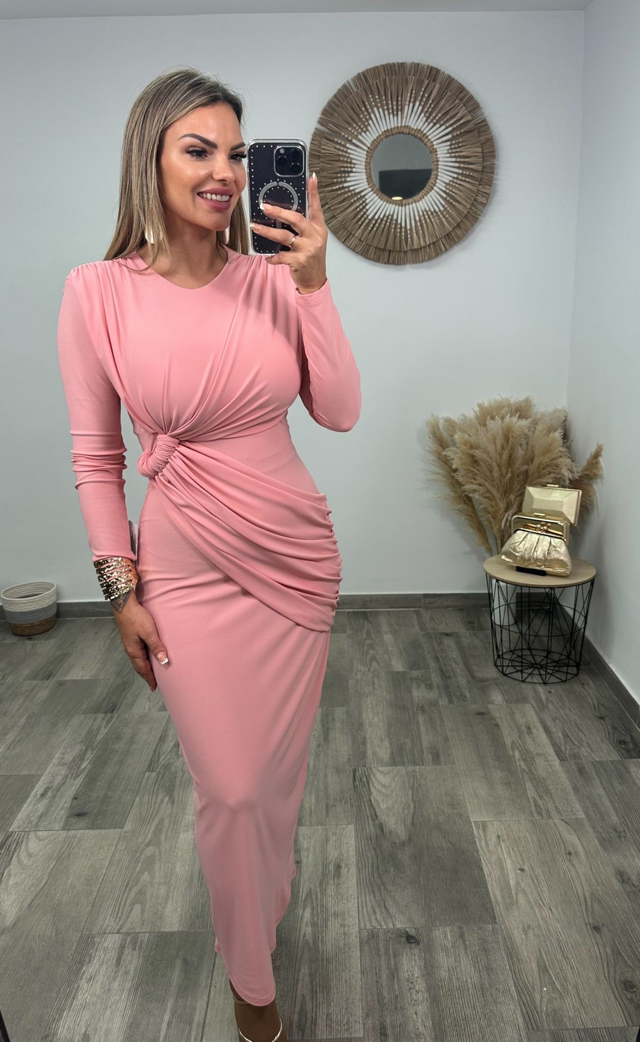 Vestido largo confeccionado en tejido elástico de gran comodidad, perfecto para realzar la silueta con elegancia. Incorpora hombreras estructuradas, que aportan un toque sofisticado y estilizan la figura. Su diseño con efecto drapeado y nudo lateral en la cintura favorece tanto a mujeres que buscan resaltar curvas como a futuras mamás, convirtiéndolo en una prenda muy demandada por su versatilidad.