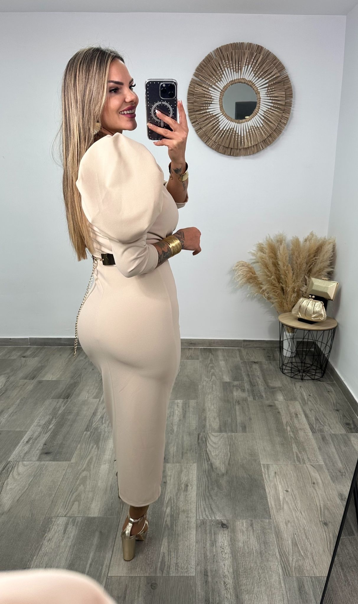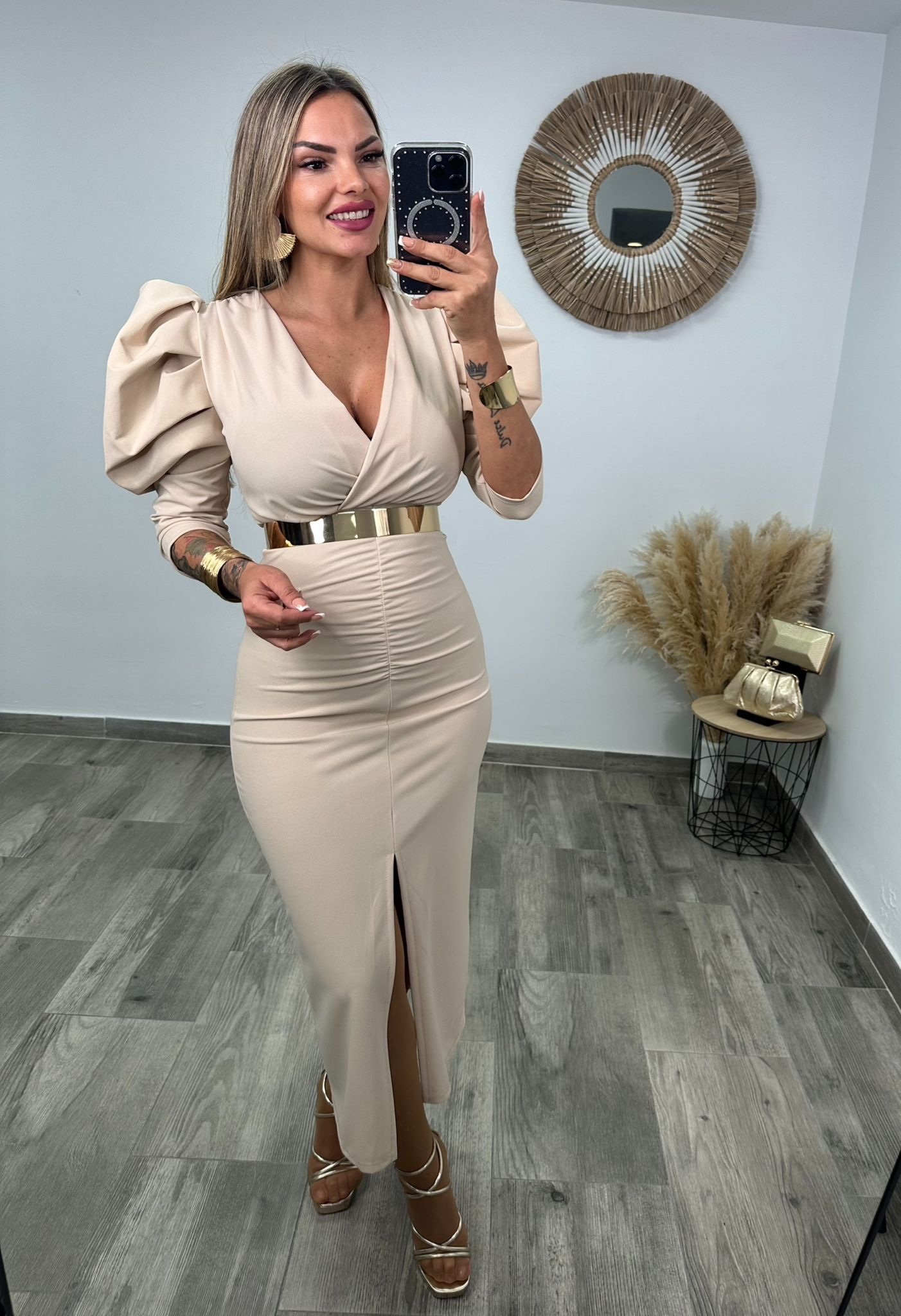 Vestido de corte midi elegante y favorecedor, ideal para invitadas que buscan estilo y sofisticación. Su diseño destaca por las mangas de farol con hombreras incorporadas, que aportan estructura y un aire sofisticado al look.