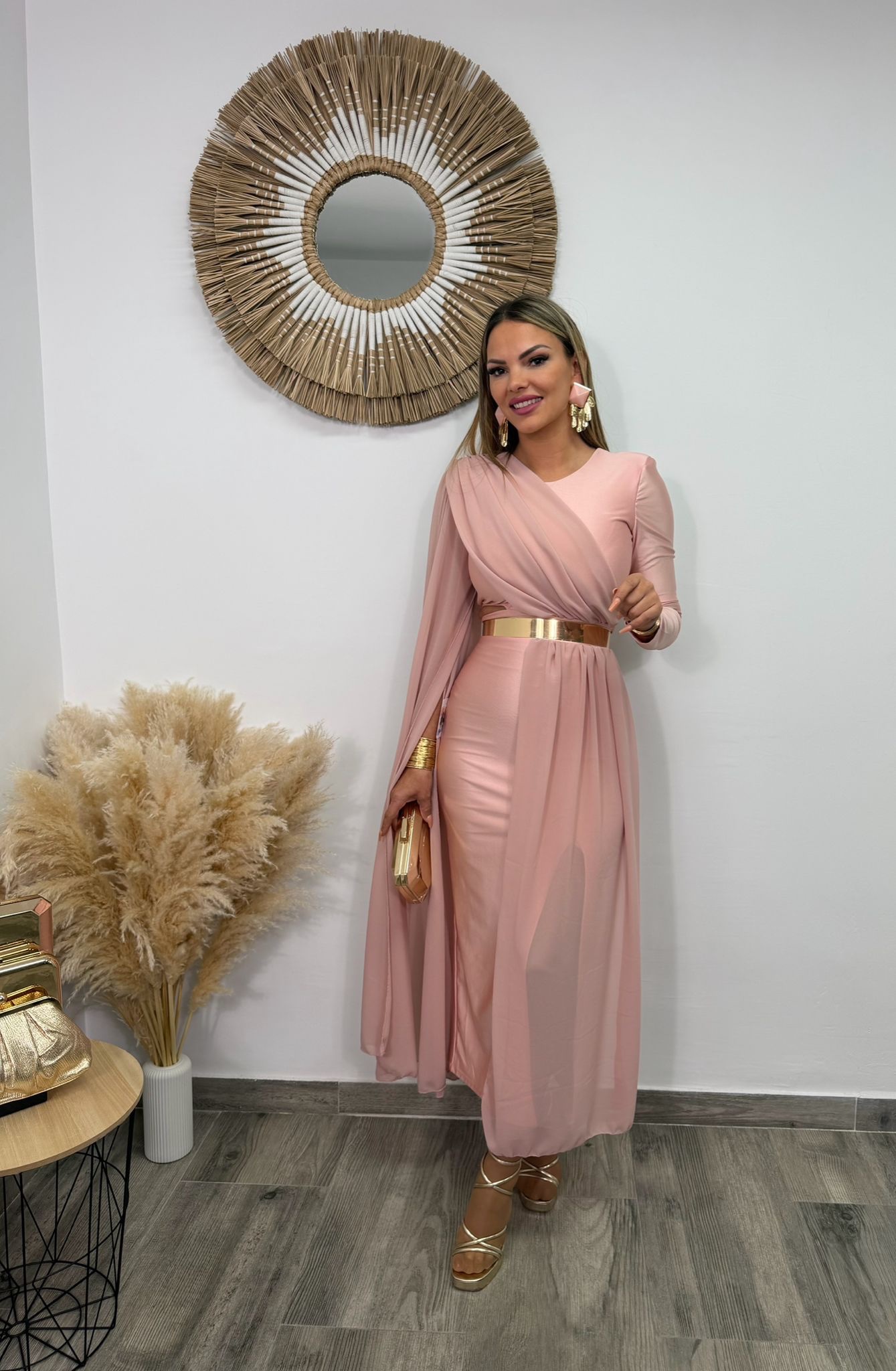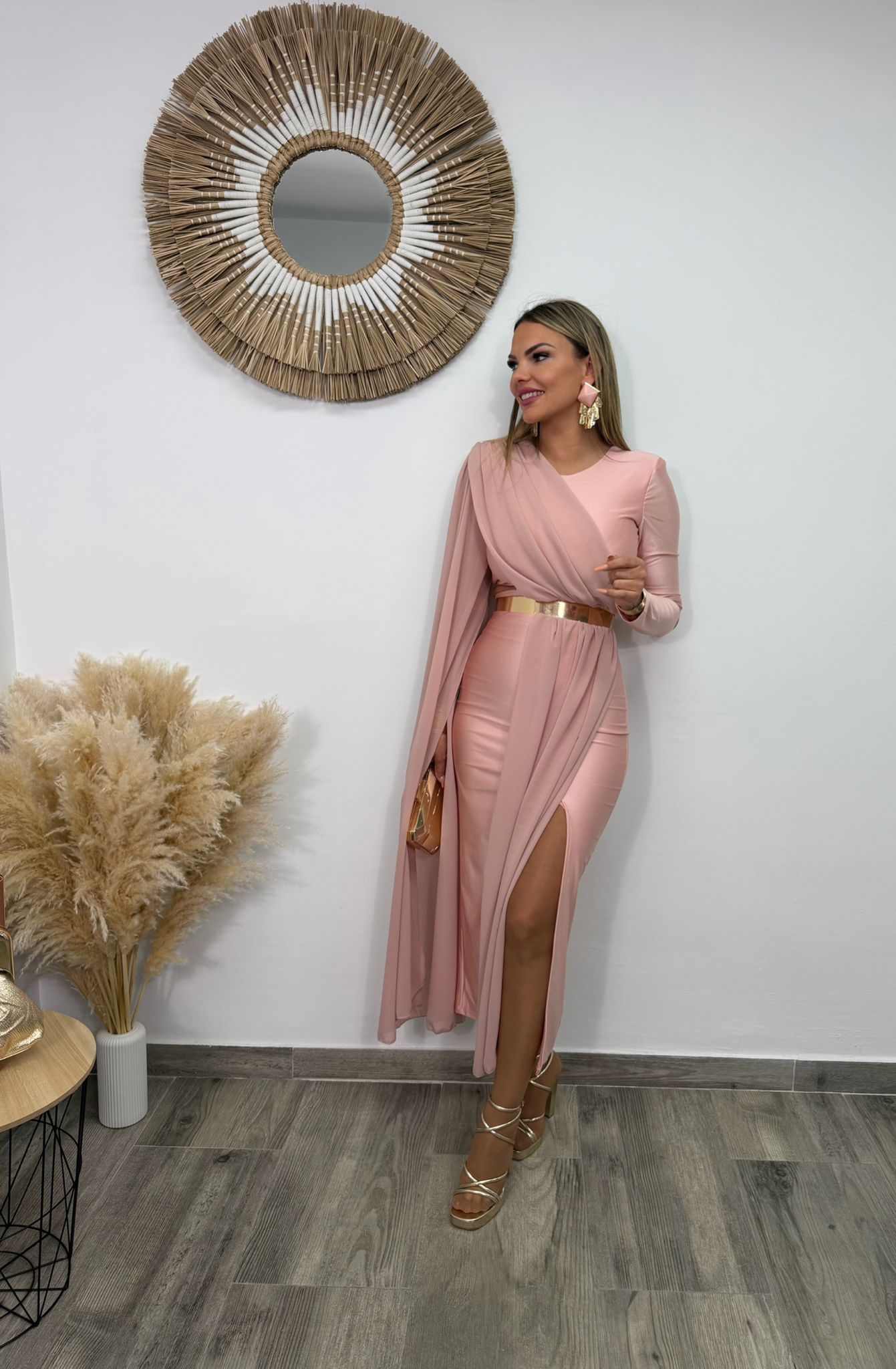 De manga larga y con caída de gasa que aporta un aire de glamour, este vestido es perfecto para ocasiones especiales donde quieras destacar con estilo y elegancia.