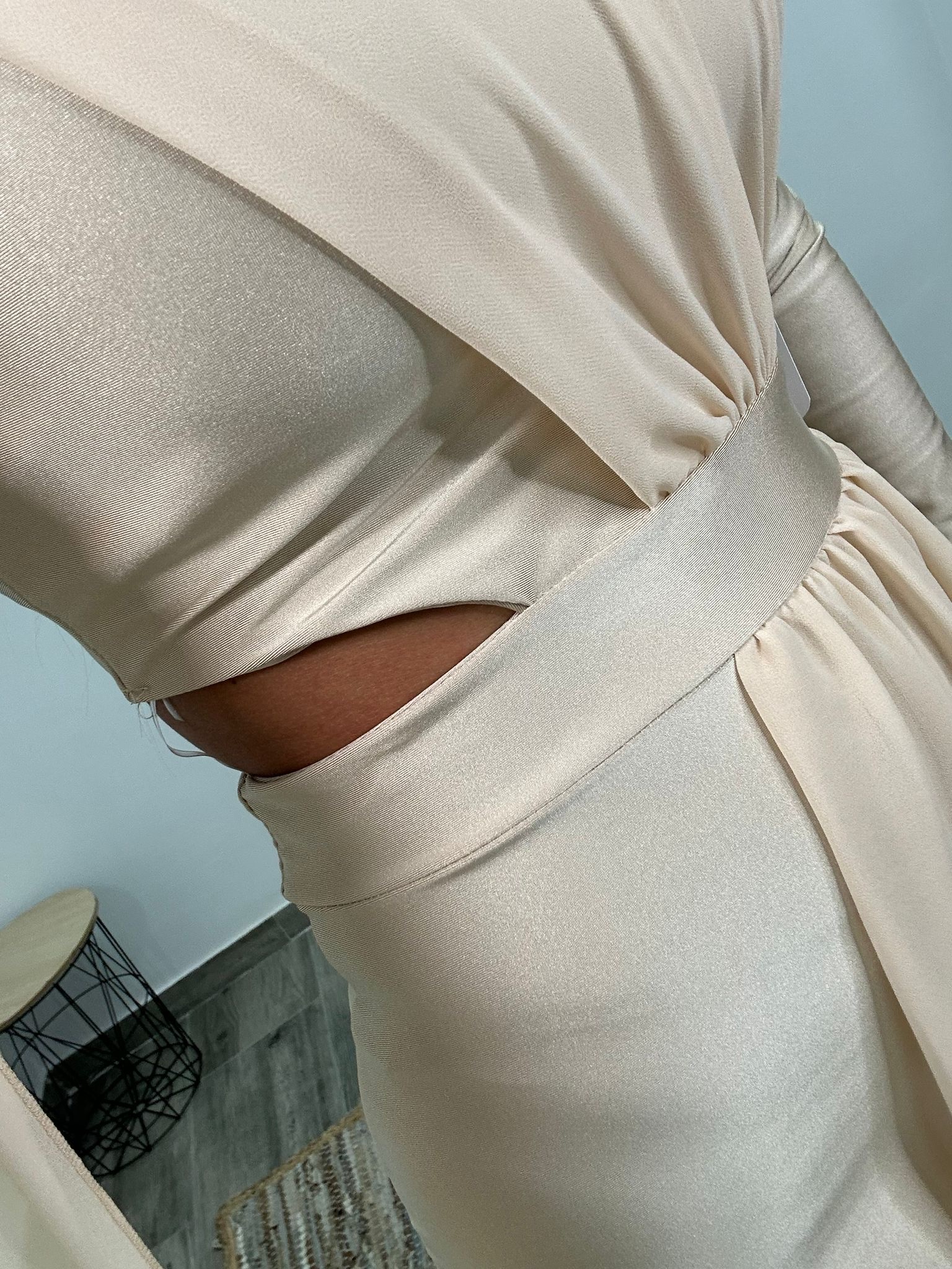 El Vestido Tena es una pieza elegante y sofisticada confeccionada en lycra satinada con detalles de gasa que le aportan un movimiento fluido y distinguido. Su diseño incluye un delicado drapeado en la parte superior, corte en la cintura que estiliza la silueta y abertura en la falda que realza la figura con un toque de sensualidad.