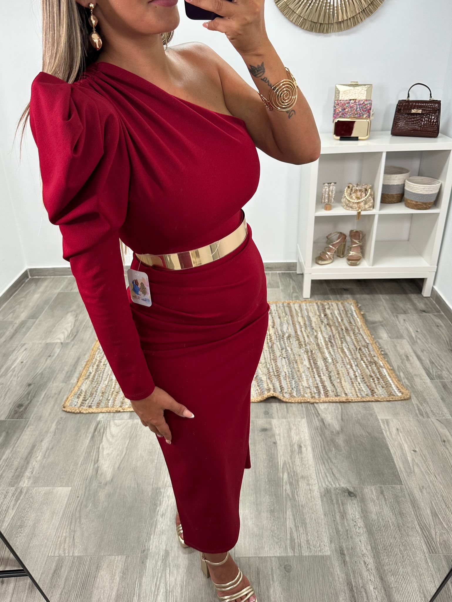 Un vestido de fiesta sofisticado y vanguardista, confeccionado en tela elástica que se adapta perfectamente a la silueta, resaltando las curvas con comodidad. Su diseño asimétrico aporta un aire moderno y único: lleva manga larga en el lado izquierdo, realzada con una hombrera incorporada que aporta estructura y fuerza al look, equilibrando el escote de un solo hombro.