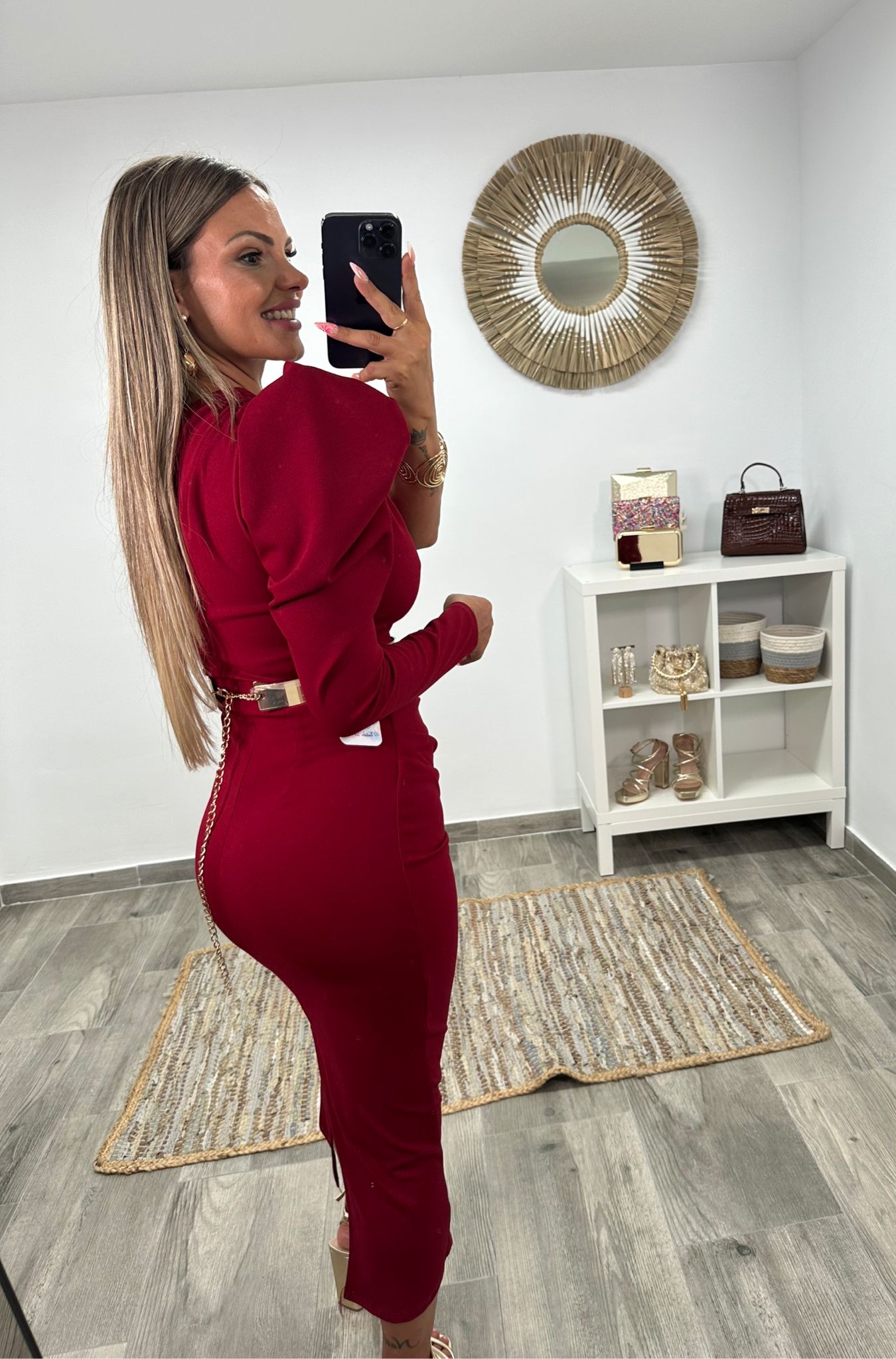 La cintura queda definida y estilizada con la opción de cinturón metálico, mientras que la falda de corte entallado cae elegante hasta el suelo, rematada con una raja discreta en la parte trasera, que facilita el movimiento y añade un toque sensual y refinado.