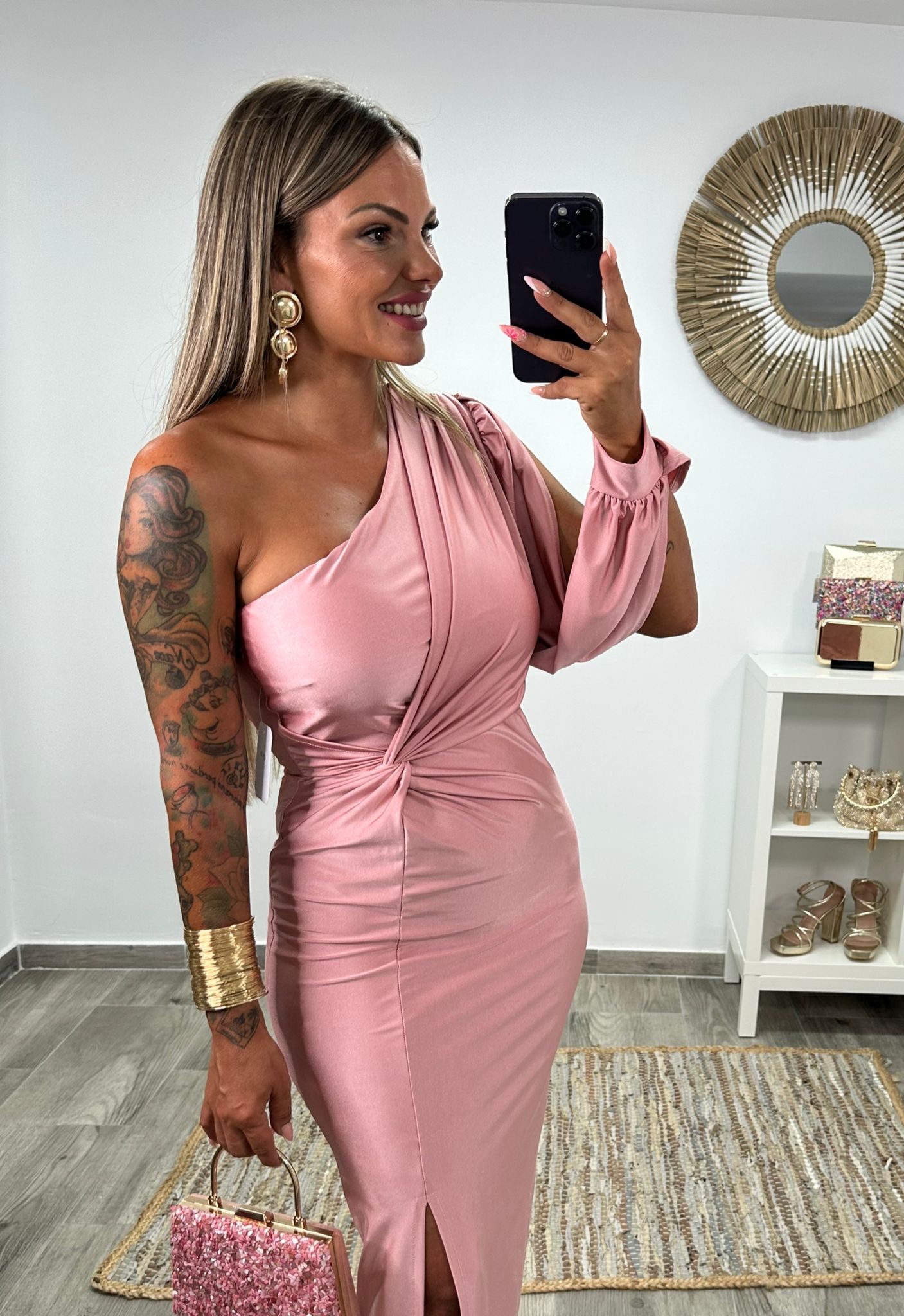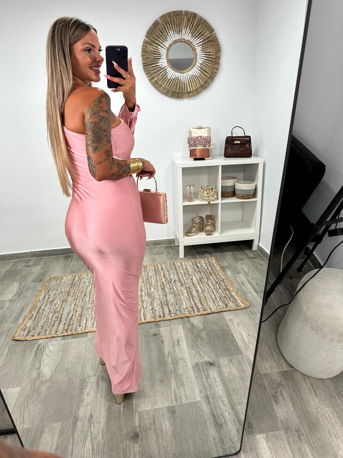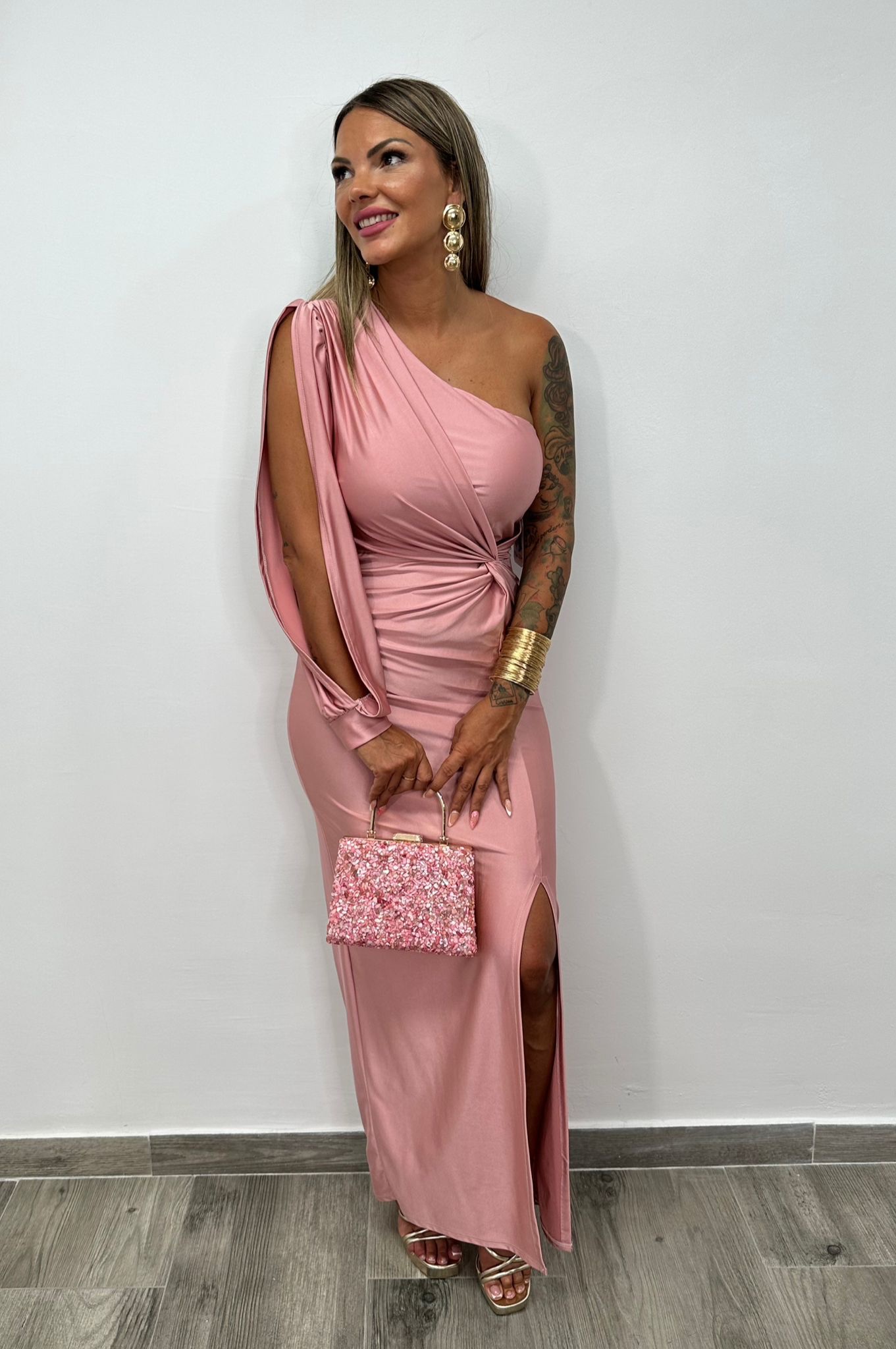 El frente destaca con un drapeado en el abdomen y un nudo lateral que estiliza la cintura, mientras que la falda larga se completa con una raja en la pierna izquierda, que añade sensualidad y movimiento a cada paso. Las tonalidades elegidas de nuestro Vestido Dalia refuerza su estilo delicado y romántico, perfecto para bodas, galas o eventos de noche.