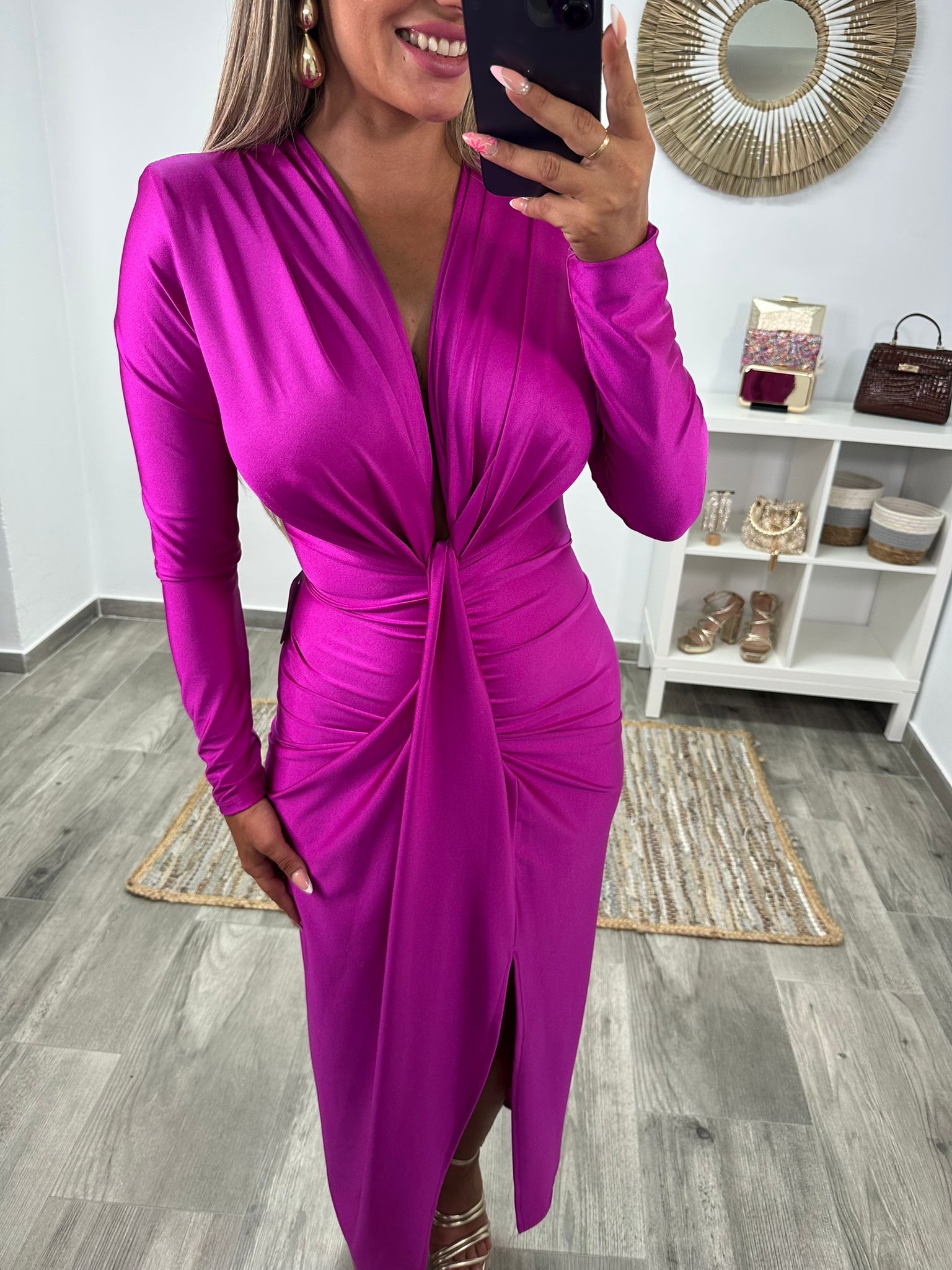 En la parte frontal luce un escote profundo en “V” con drapeado, rematado con un nudo central en la cintura, que estiliza y crea un efecto reloj de arena. La falda larga cae con fluidez y está realzada por una raja frontal derecha que añade movimiento y sensualidad a cada paso.