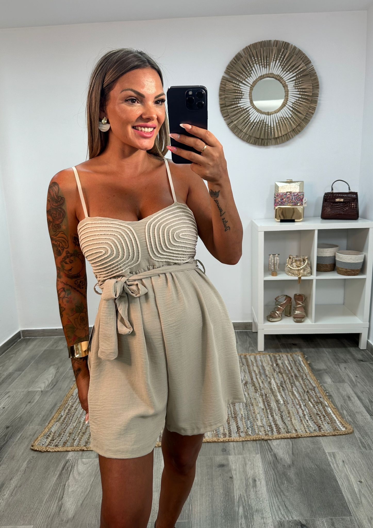 Este precioso mono corto combina comodidad y estilo en una sola pieza. El top destaca por su original diseño de bordado geométrico en contraste, que realza el escote de forma elegante y llamativa. La parte inferior, tipo short fluido, cuenta con un cinturón lazada que marca la cintura y aporta un toque femenino.