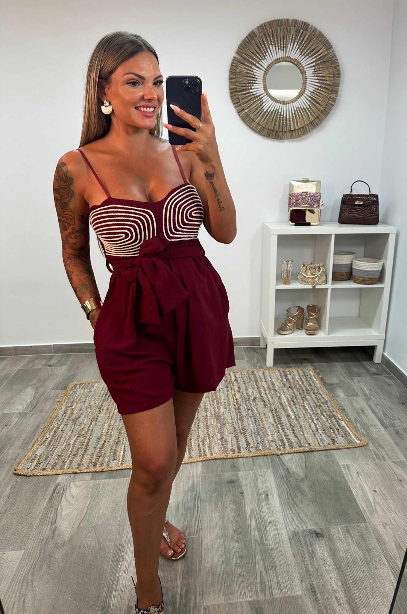 Este precioso mono corto combina comodidad y estilo en una sola pieza. El top destaca por su original diseño de bordado geométrico en contraste, que realza el escote de forma elegante y llamativa. La parte inferior, tipo short fluido, cuenta con un cinturón lazada que marca la cintura y aporta un toque femenino.