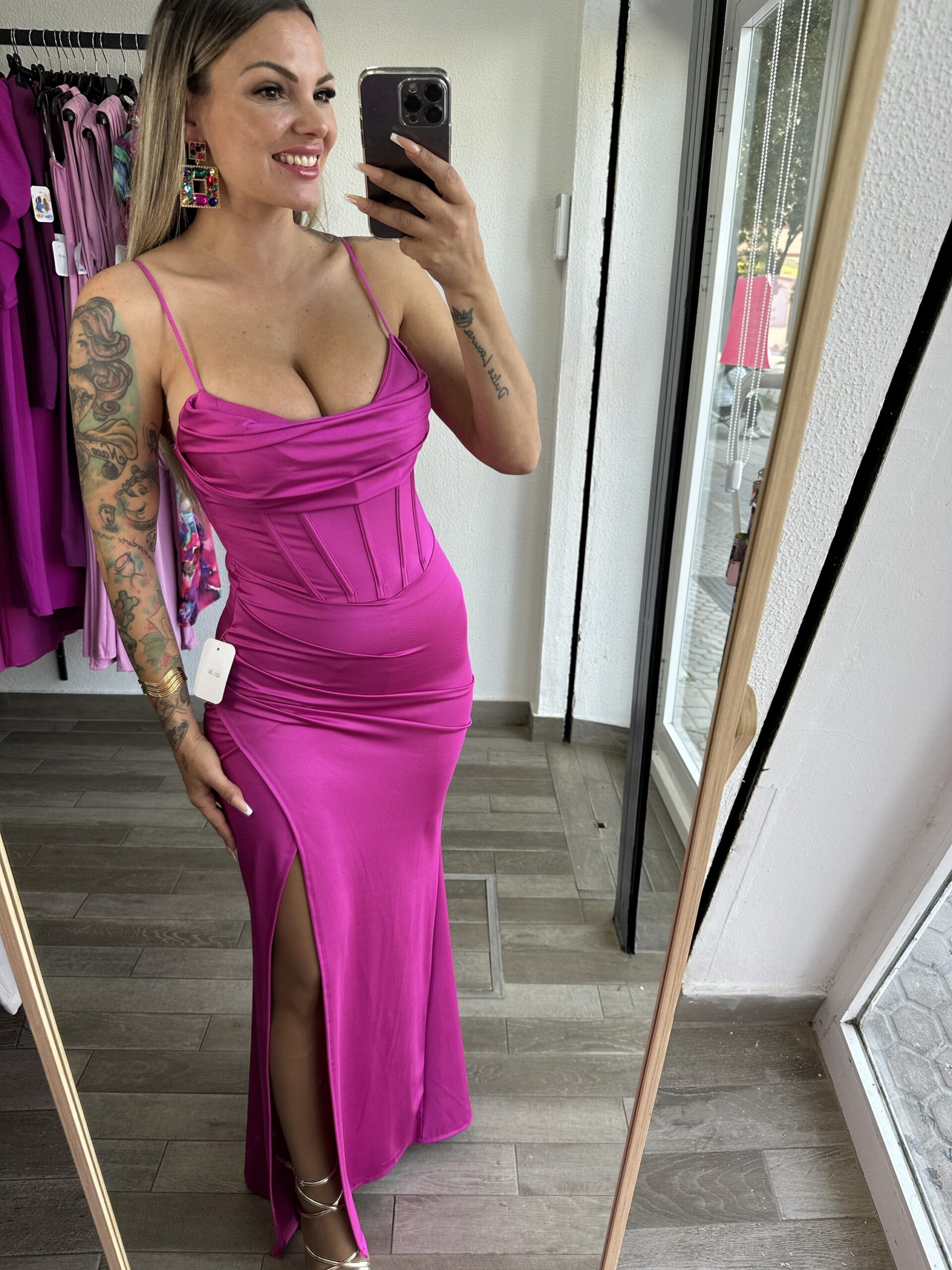 Un vestido de noche elegante y sofisticado, ideal para bodas, galas y eventos especiales. Confeccionado en licra satinada de acabado brillante, se ajusta a la figura realzando las curvas de manera favorecedora. El diseño cuenta con un cuerpo tipo corsé con efecto drapeado en el escote y costuras marcadas que estilizan la cintura y cascos en el pecho, aportando estructura y firmeza.