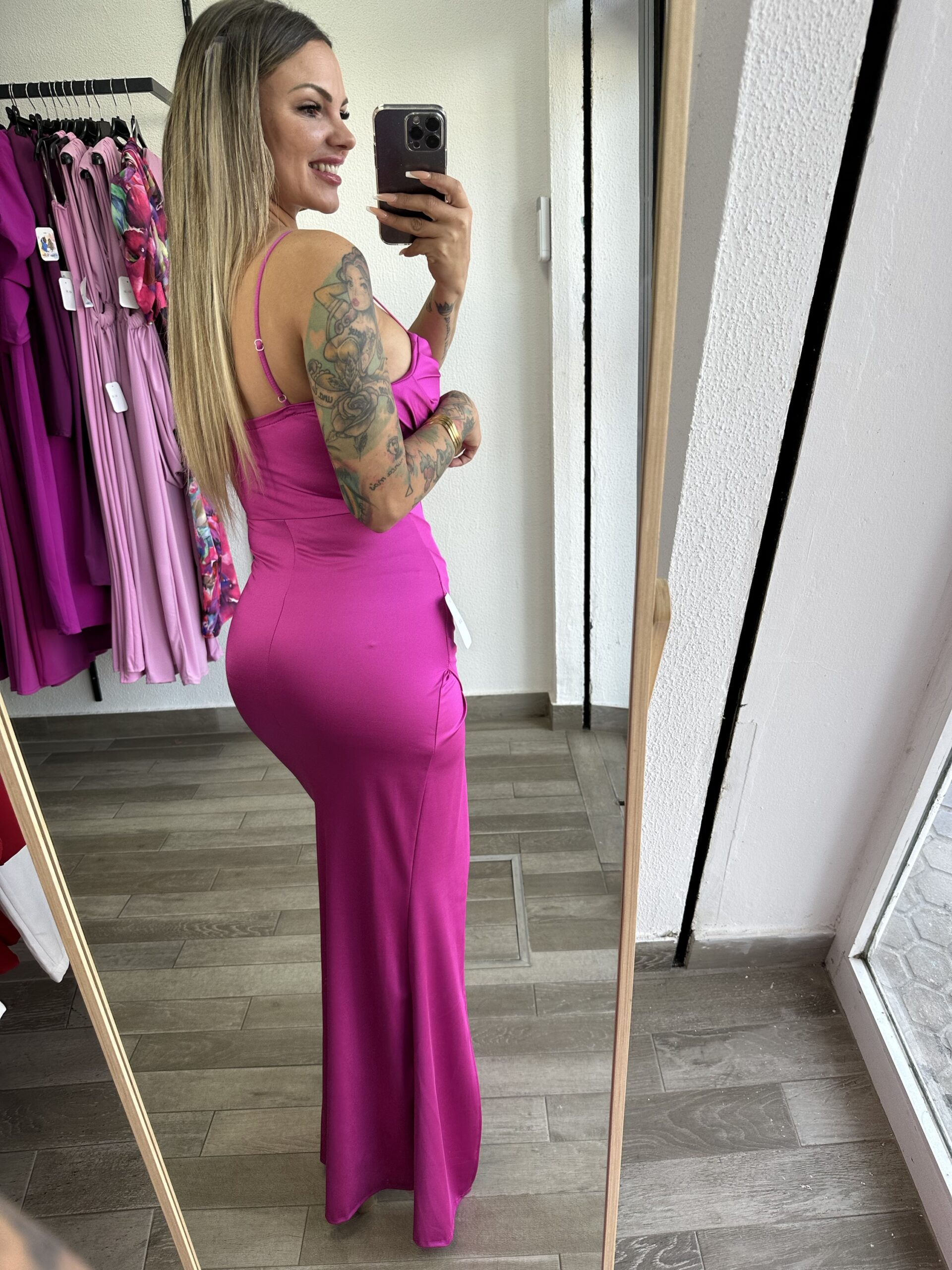 Las finas tirantas regulables enmarcan los hombros con delicadeza, mientras que la falda larga, de corte entallado, se abre con una raja izquierda frontal hasta el muslo, que añade sensualidad y libertad de movimiento. La parte trasera se ajusta suavemente, resaltando la silueta con un acabado impecable.