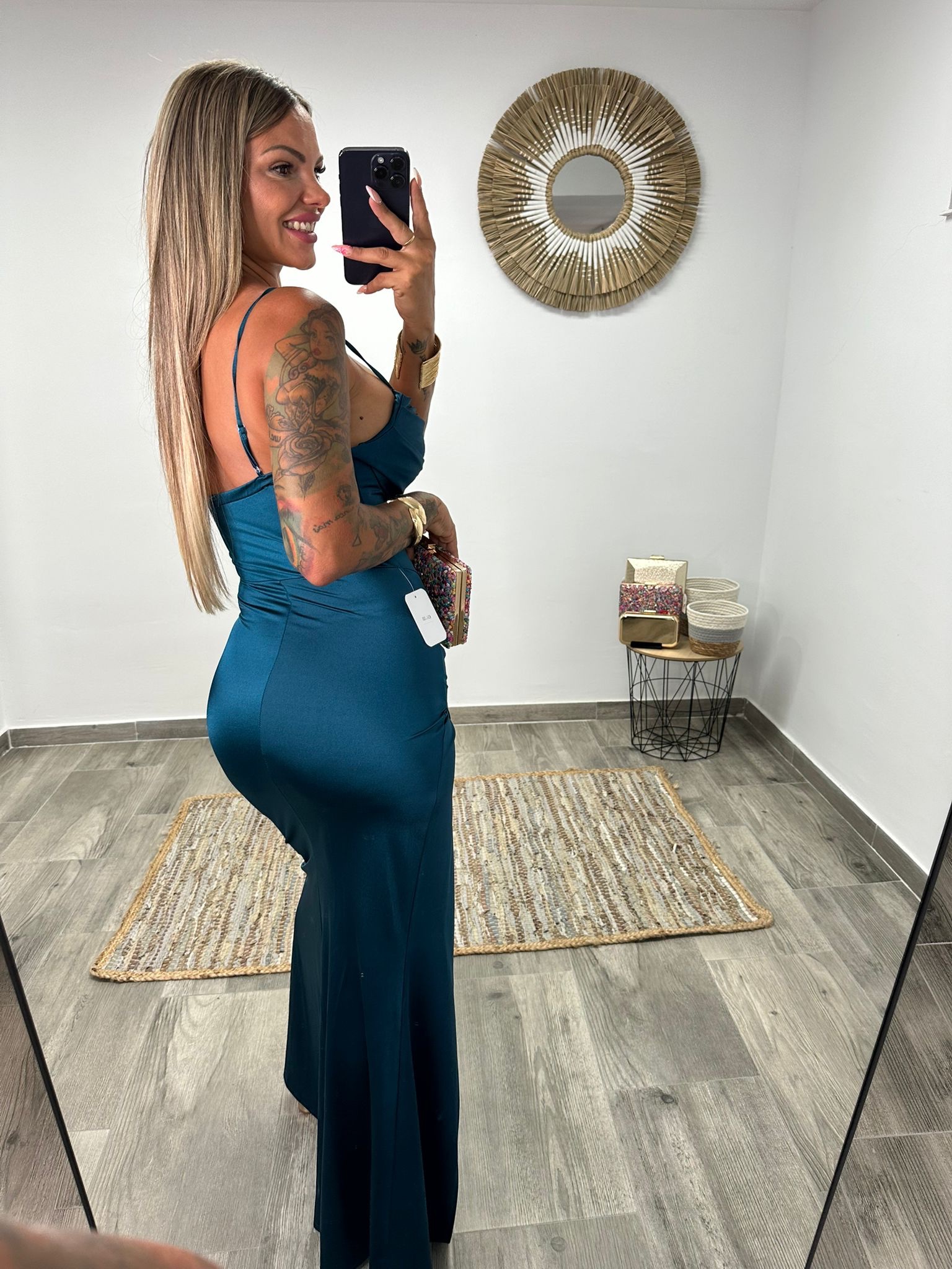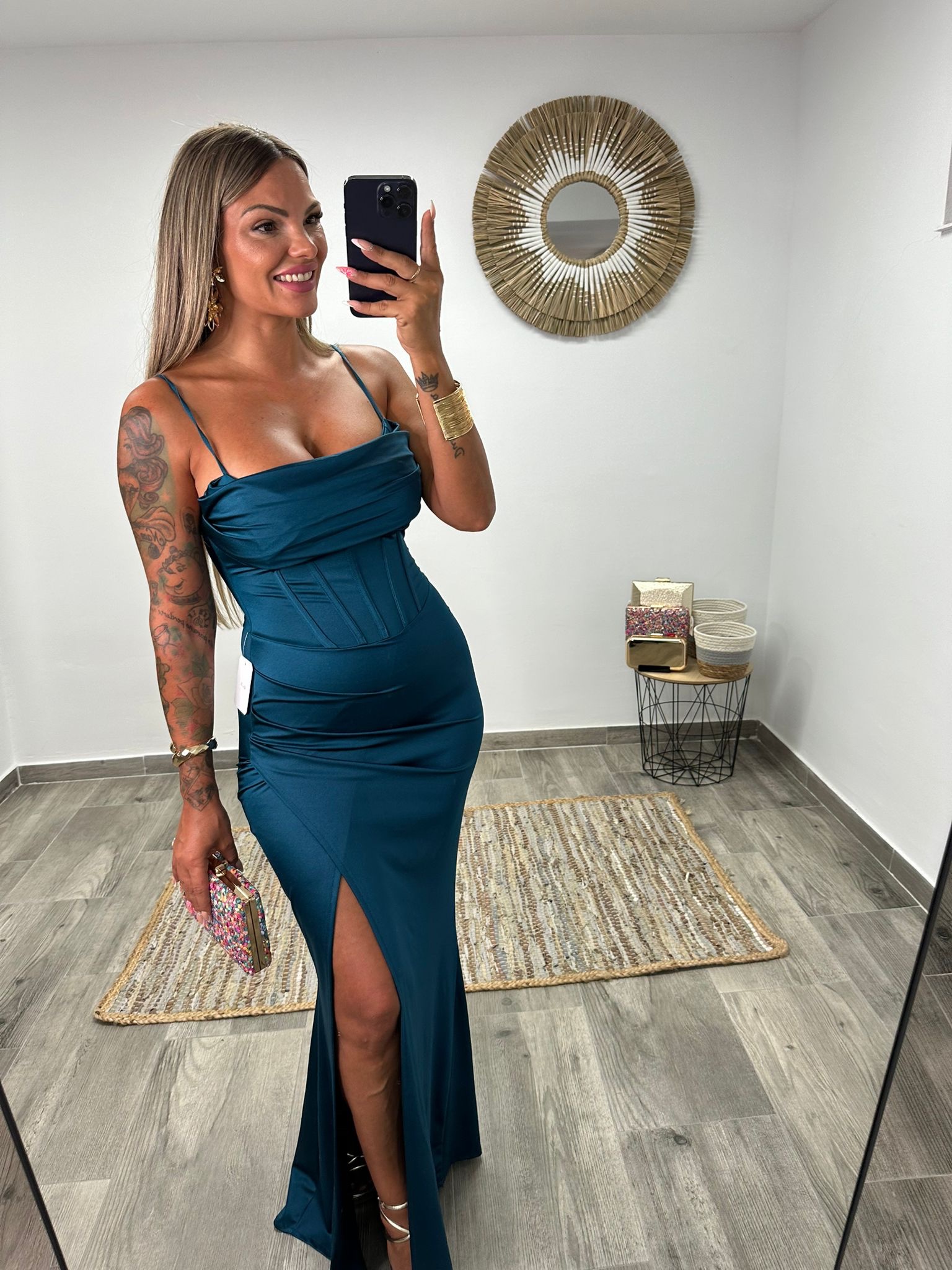 Las finas tirantas regulables enmarcan los hombros con delicadeza, mientras que la falda larga, de corte entallado, se abre con una raja izquierda frontal hasta el muslo, que añade sensualidad y libertad de movimiento. La parte trasera se ajusta suavemente, resaltando la silueta con un acabado impecable.