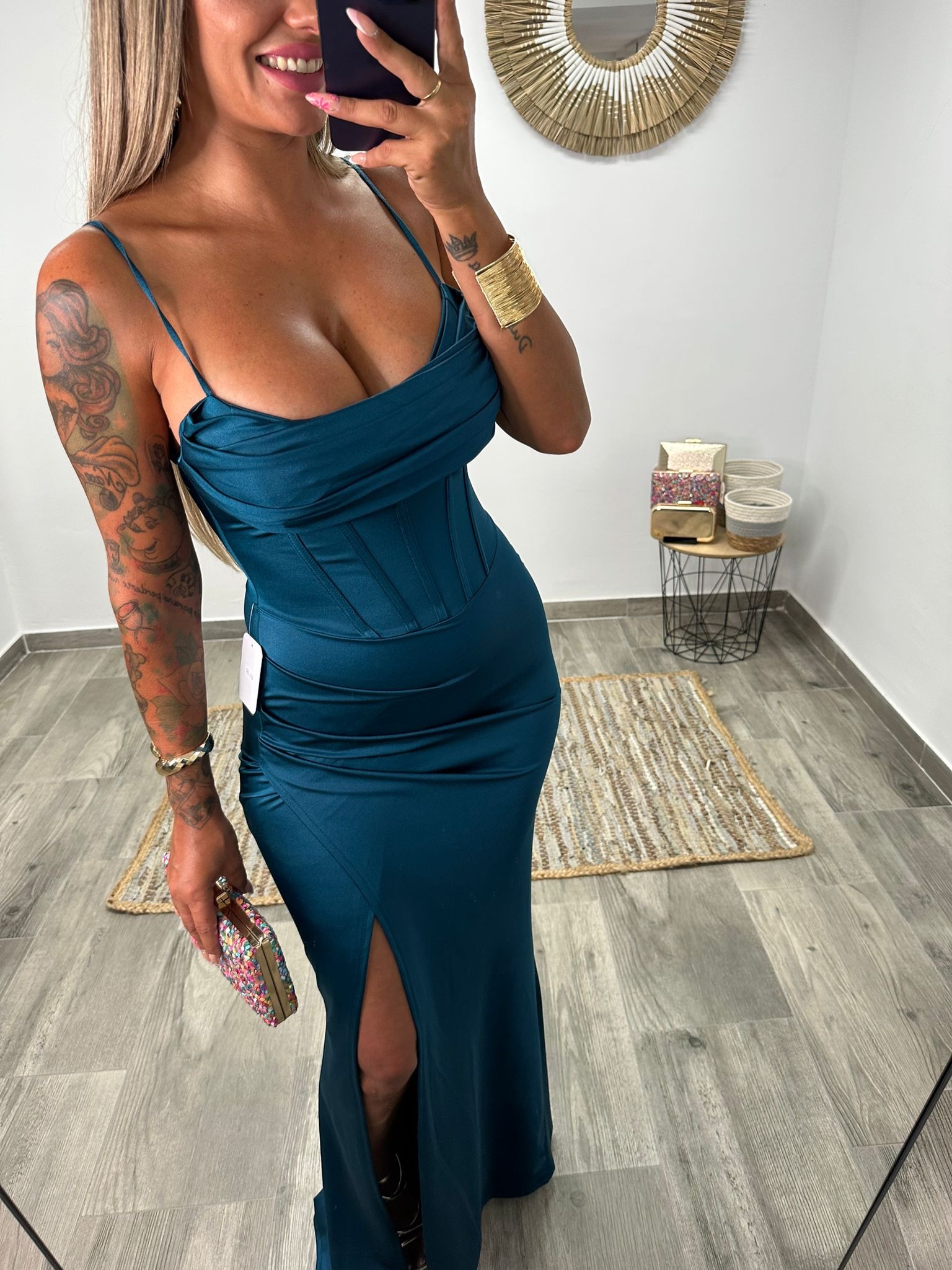 Un vestido de noche elegante y sofisticado, ideal para bodas, galas y eventos especiales. Confeccionado en licra satinada de acabado brillante, se ajusta a la figura realzando las curvas de manera favorecedora. El diseño cuenta con un cuerpo tipo corsé con efecto drapeado en el escote y costuras marcadas que estilizan la cintura y cascos en el pecho, aportando estructura y firmeza.