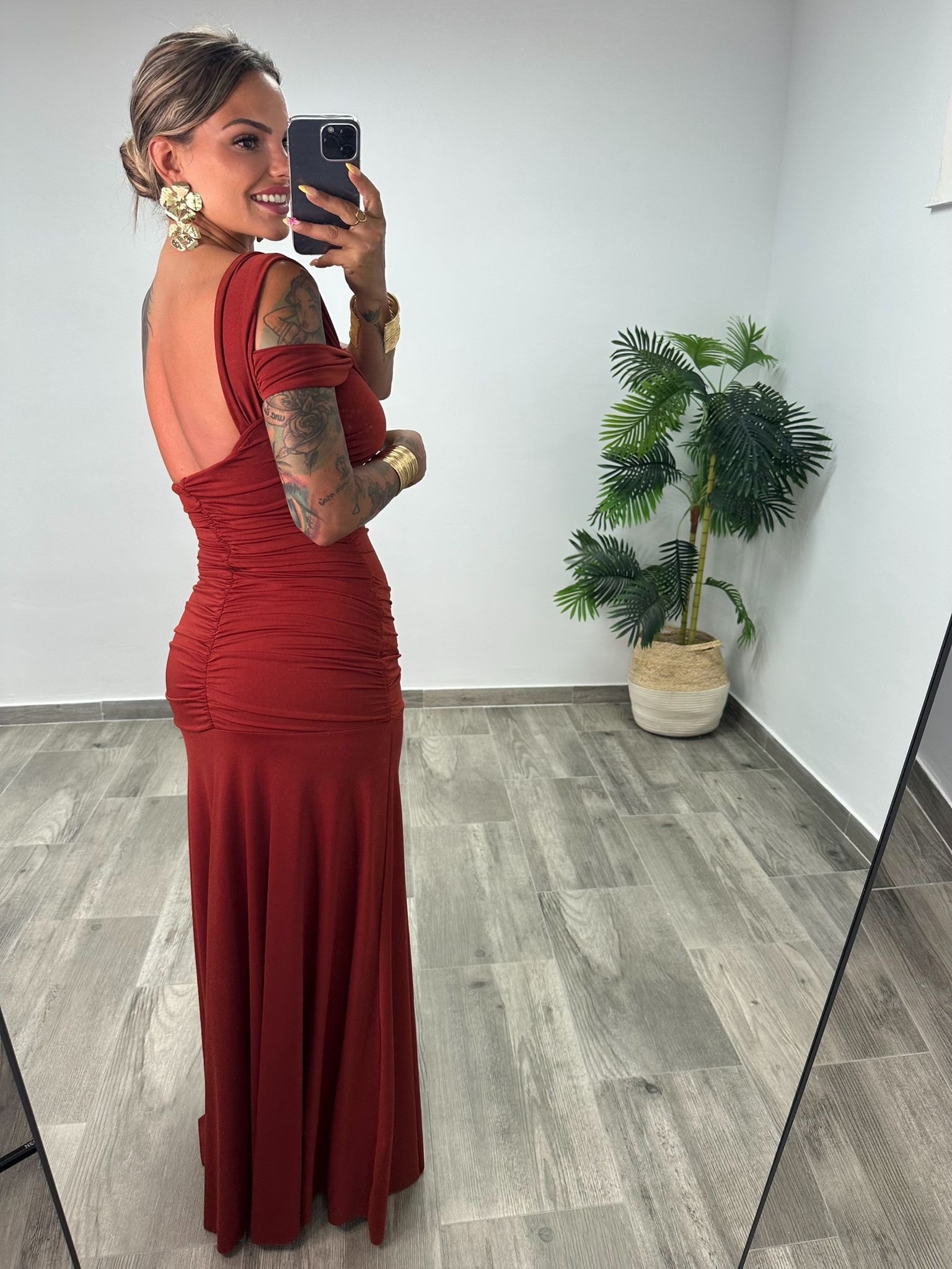 El diseño cuenta con un escote cruzado off-shoulder, que deja los hombros al descubierto y aporta un aire sofisticado y sensual. Incorpora cascos en el pecho, ofreciendo sujeción y realce sin necesidad de sujetador. La falda larga cae con movimiento fluido y está rematada con una raja lateral derecha hasta el muslo, que añade un toque de sensualidad y ligereza a cada paso.
