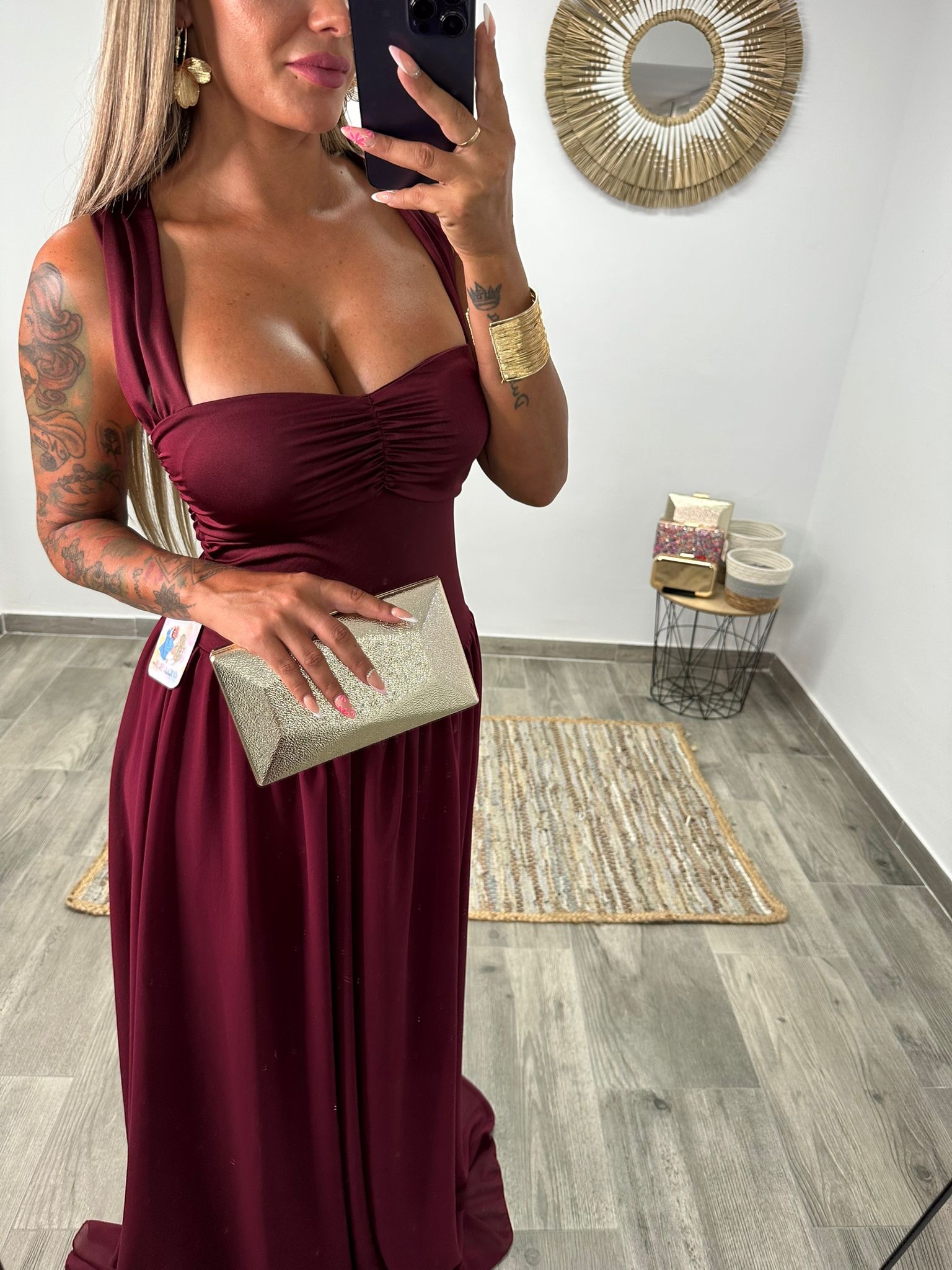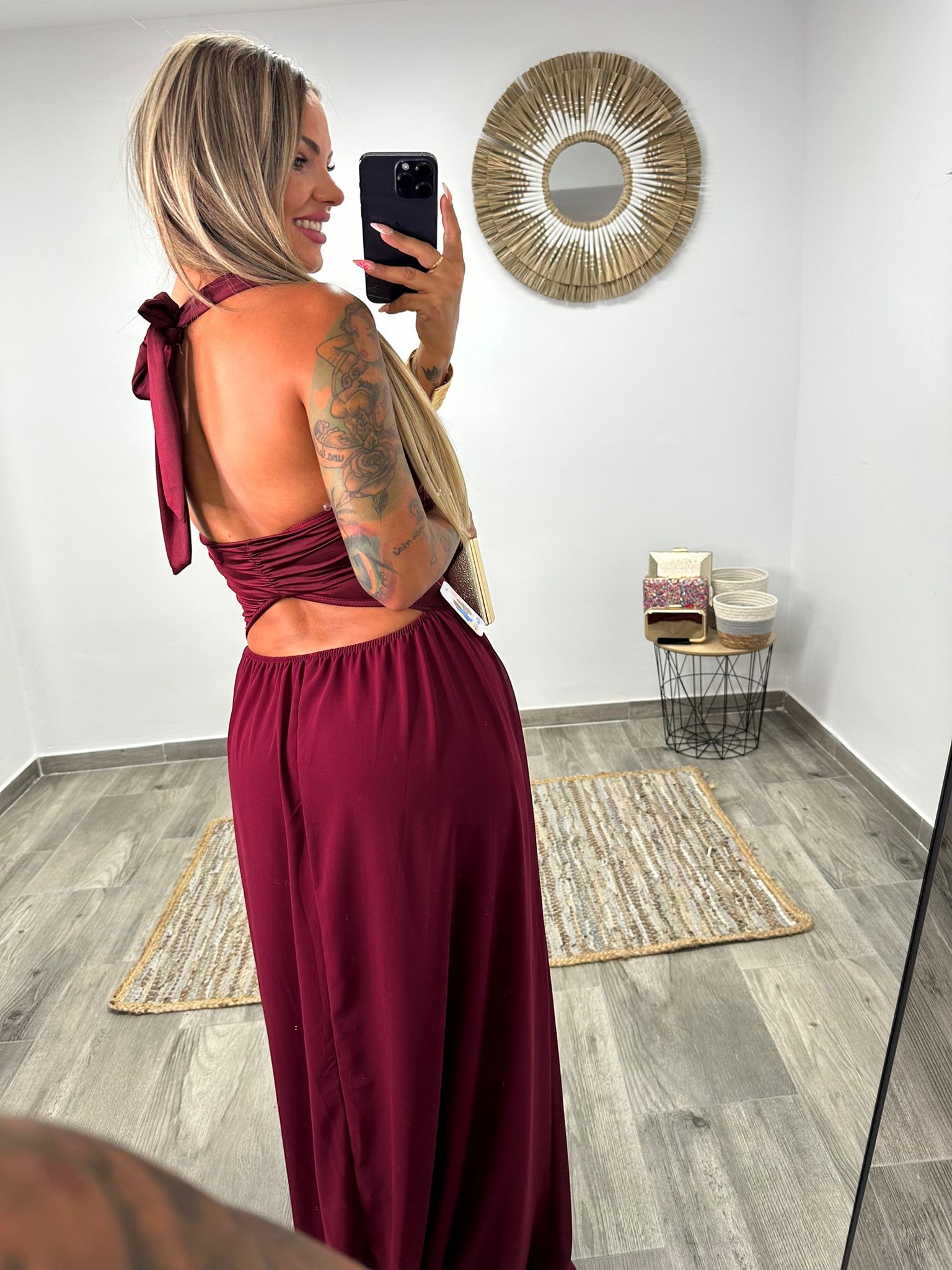 Las anchas tirantas se anudan en la espalda, dejando un escote descubierto y sensual, mientras que la falda de corte largo y amplio cae con elegancia, aportando vuelo y soltura a cada paso. Los tonos a elegir ( Petróleo y burdeo ) lo convierte en una opción clásica y refinada, perfecta para destacar en ocasiones especiales.