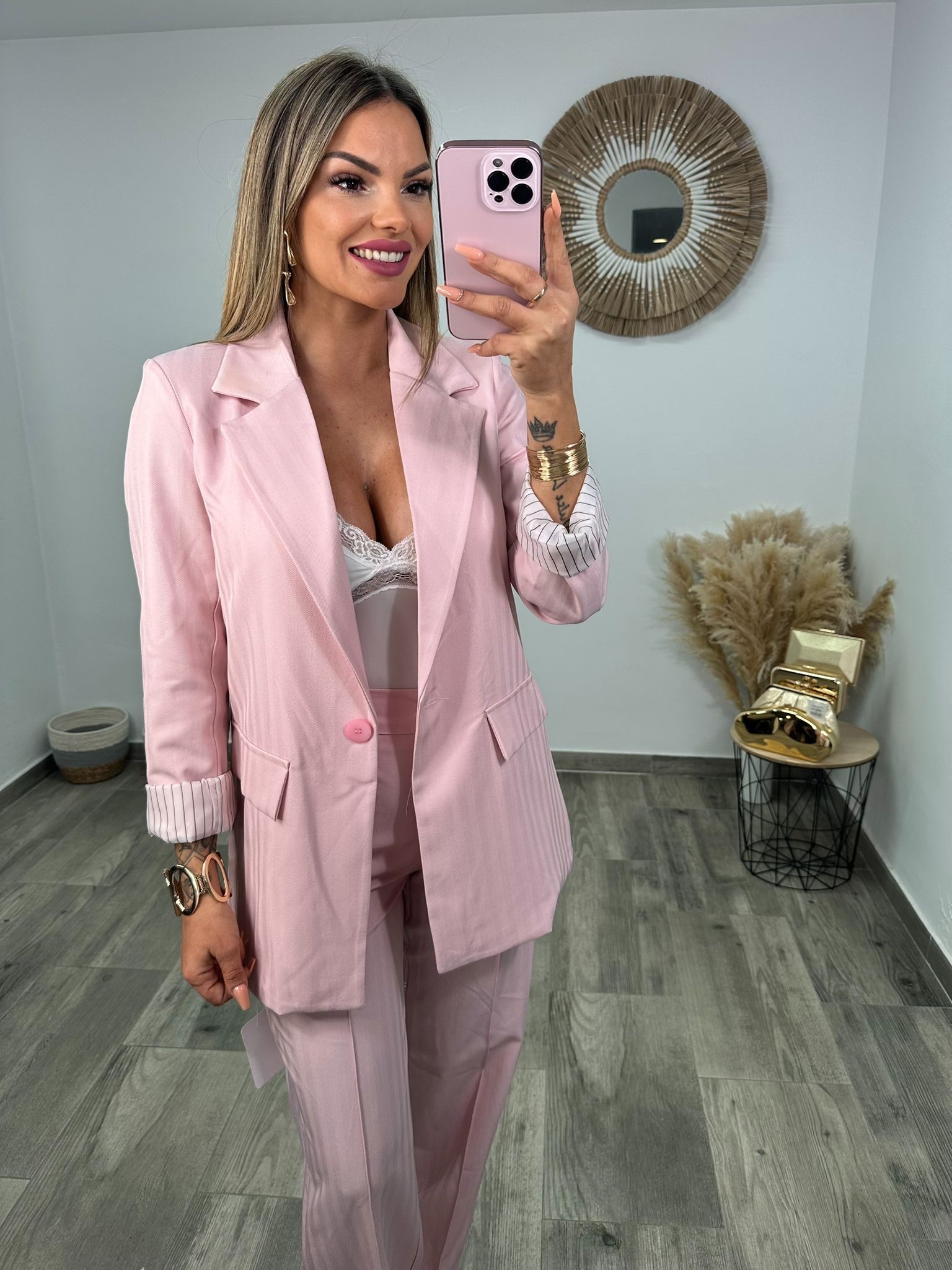 Conjunto de chaqueta y pantalón con diseño elegante y femenino.