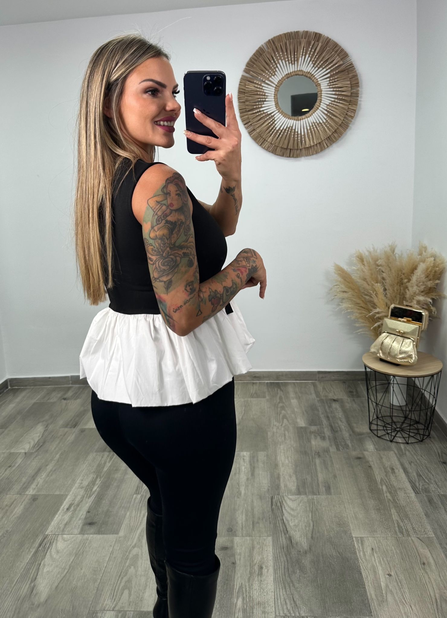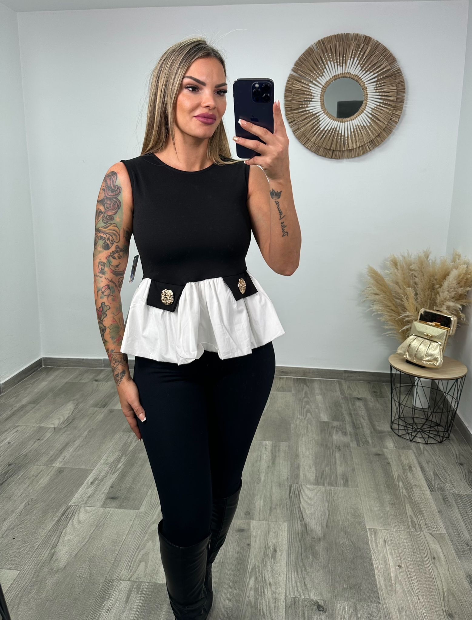 Destaca por su volante en la parte inferior, que crea un bonito efecto peplum y ayuda a estilizar la cintura. Incorpora detalles decorativos tipo joya en el frontal, que aportan un toque especial y elevan la prenda, convirtiéndola en una opción perfecta tanto para looks más arreglados como para combinar con prendas básicas.