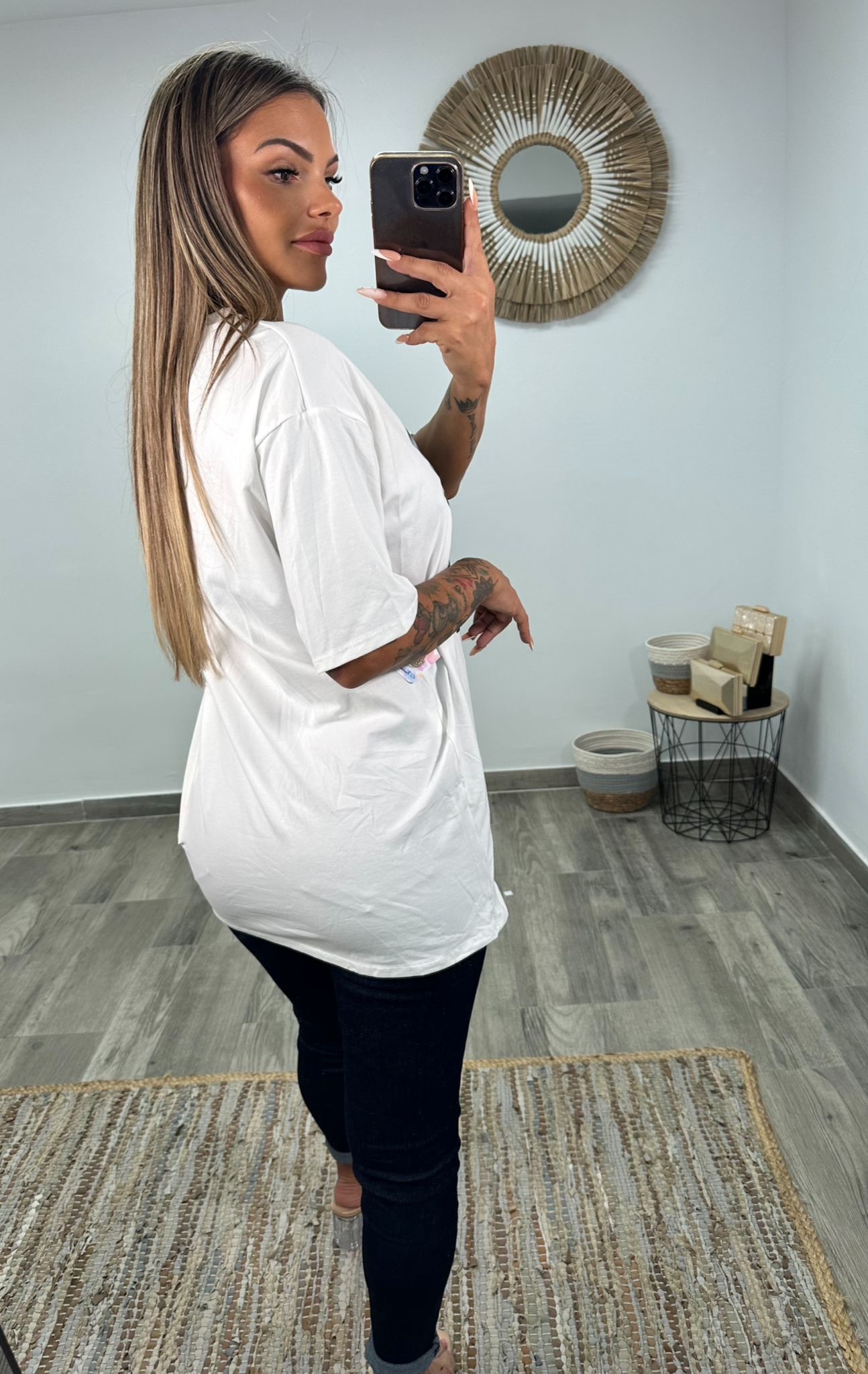 Esta camiseta es perfecta para quienes buscan comodidad sin perder estilo. Su diseño oversize y más larguito aporta un look moderno, relajado y muy fácil de combinar. Ideal para llevar por fuera del pantalón, con leggings, jeans o incluso como mini-vestidito si te gusta un estilo más casual y urbano.