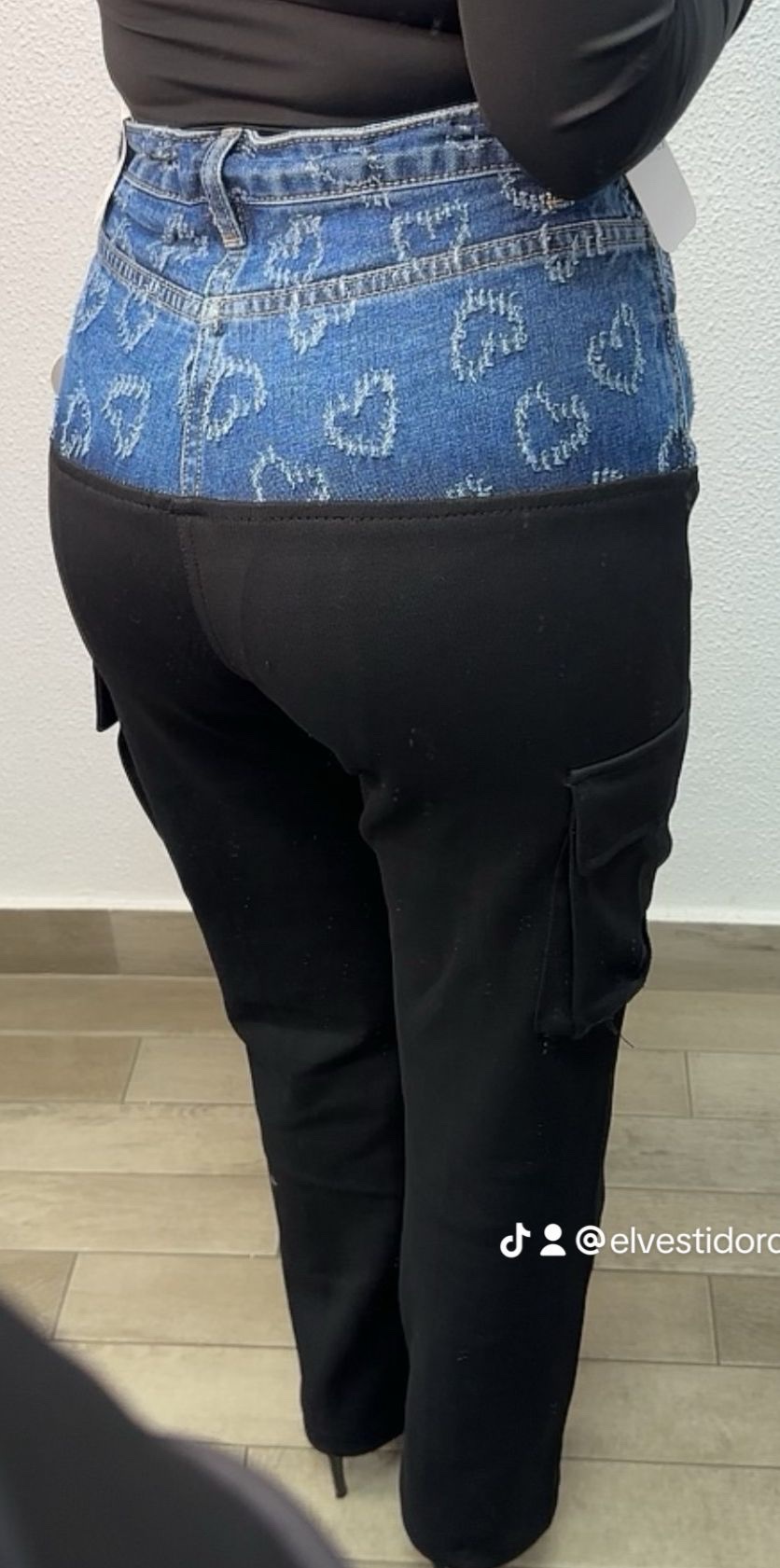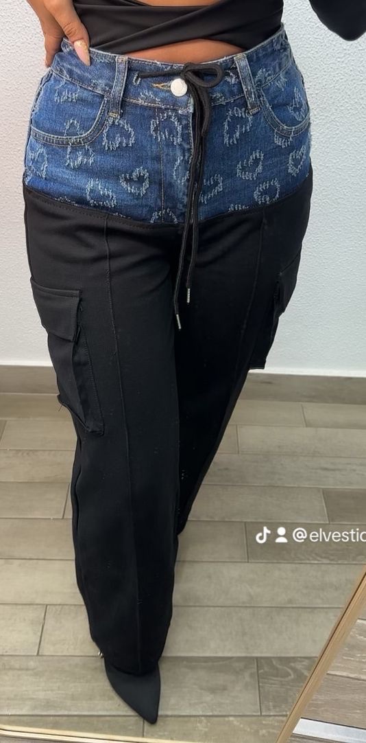 Jeans combinado de tela vaquera por la parte de arriba y de la parte de la cadera es tela de chandal, viene con un cordón en la cintura, bolsillos reales, y lanzarte vaquera relieve de corazones.