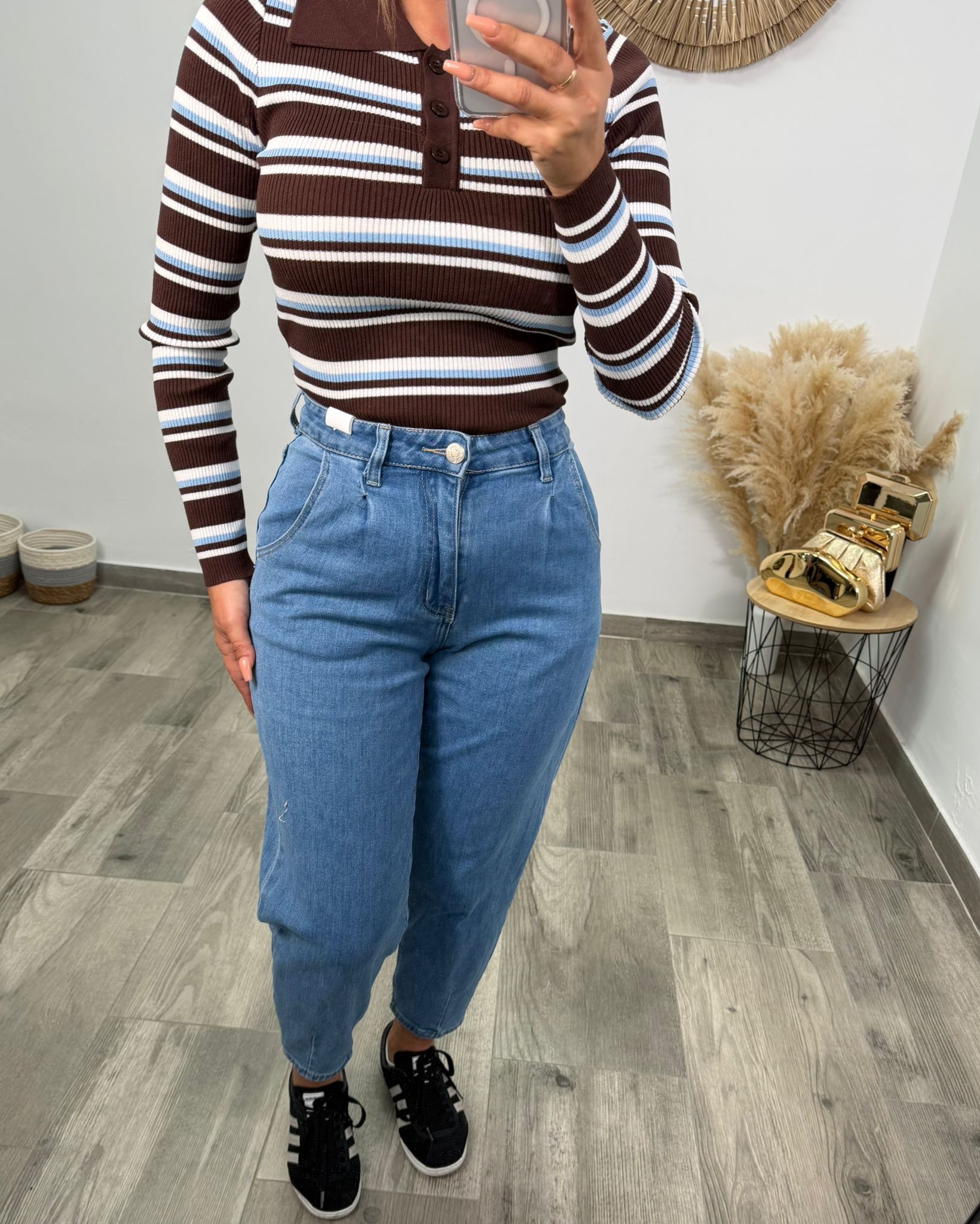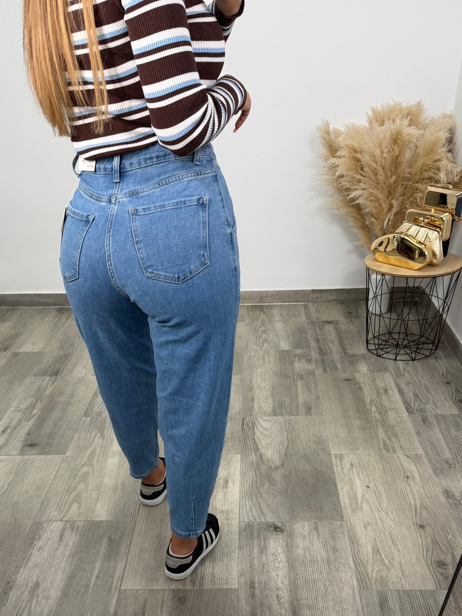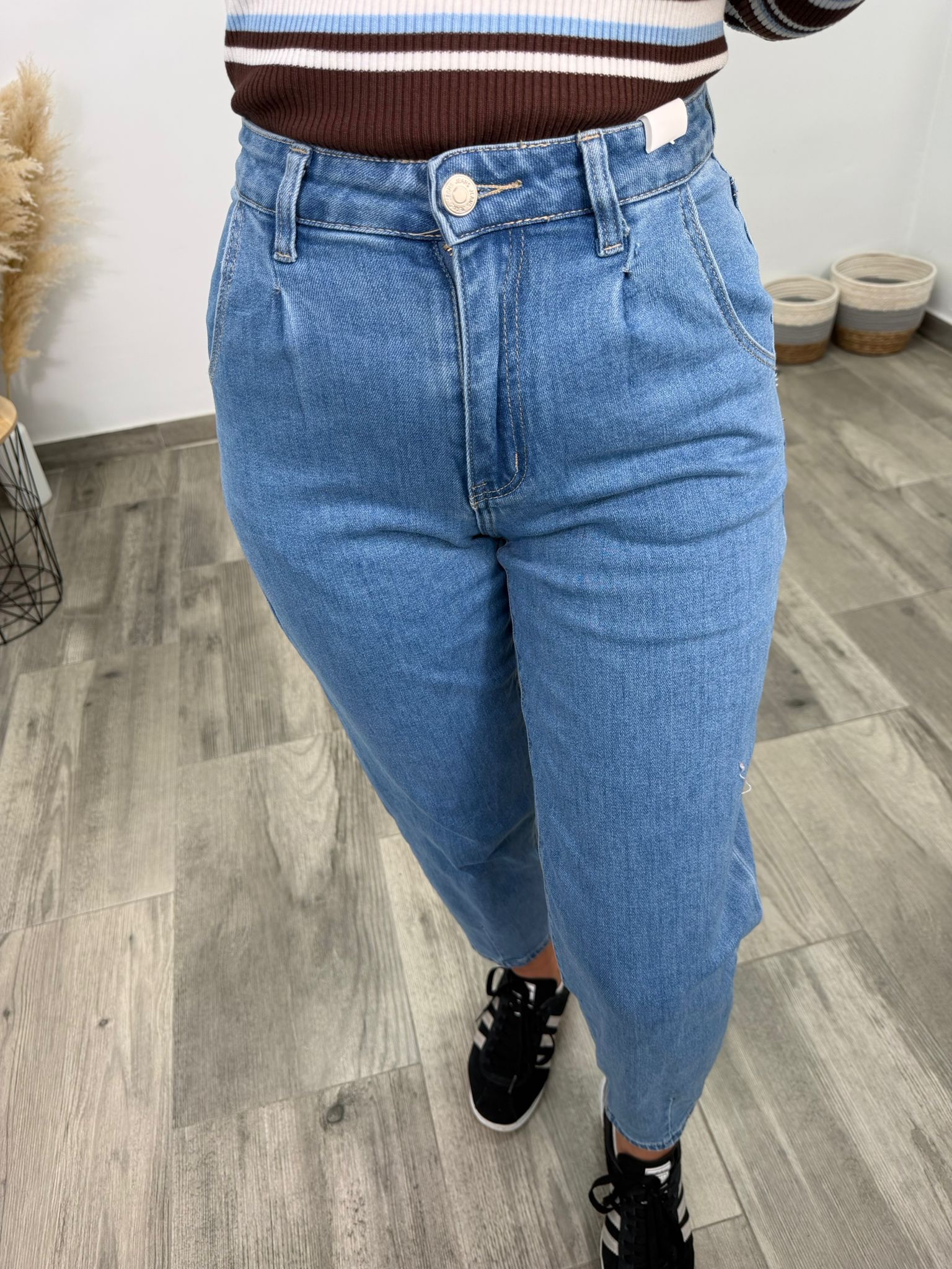 Jeans de tiro alto con diseño de pinzas que estilizan la figura y aportan un toque moderno y diferente al clásico denim. Su corte tipo Balloon ofrece un ajuste cómodo en la cintura y cadera, con caída recta que favorece todo tipo de siluetas.