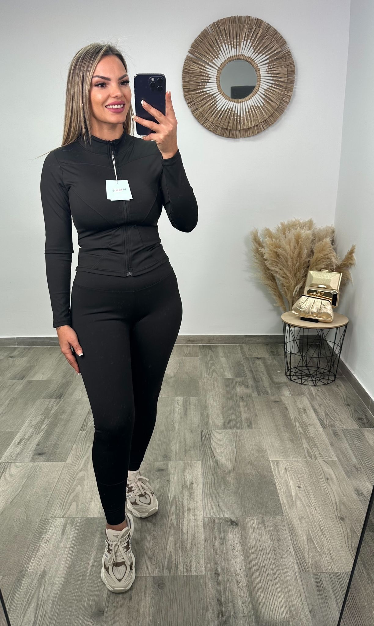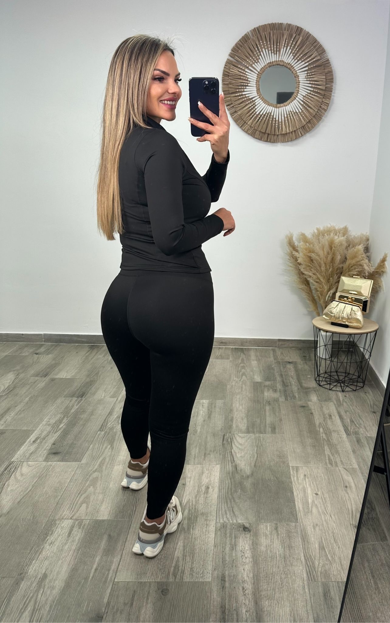La chaqueta cuenta con cremallera frontal, cuello alto y costuras estratégicas que estilizan la silueta sin oprimir. El pantalón presenta cintura alta, ofreciendo un efecto moldeador y una sujeción óptima para el día a día o la actividad deportiva.