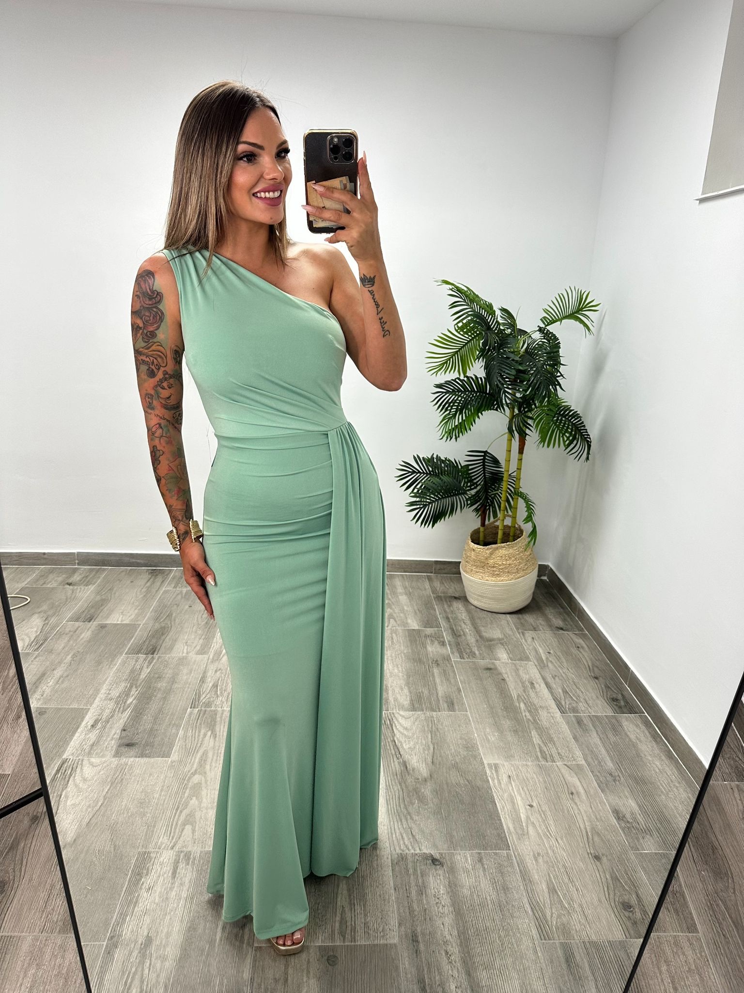 Vestido de licra, de tiranta ancha, cogido debajo del pecho y con una corbata lateral en la parte derecha y falda de vuelo por debajo , viene con doble licra.